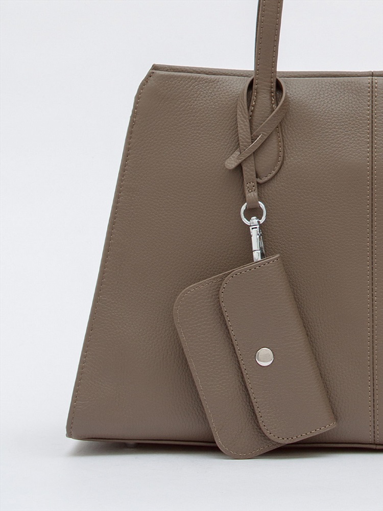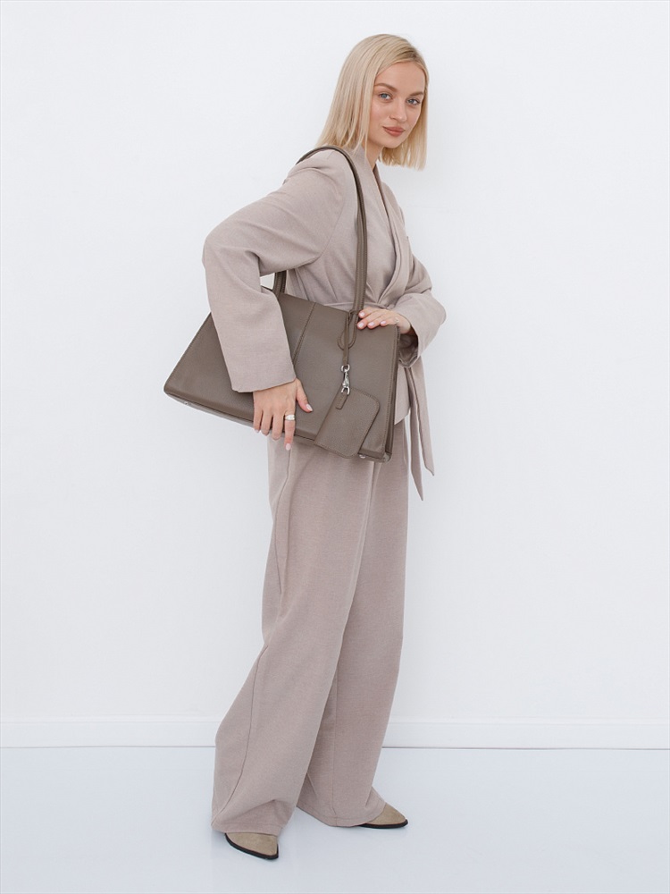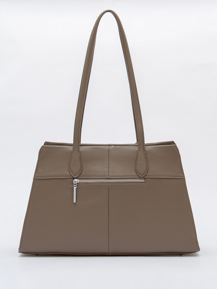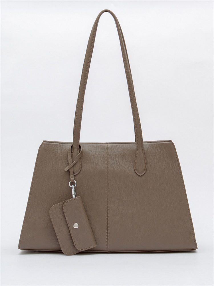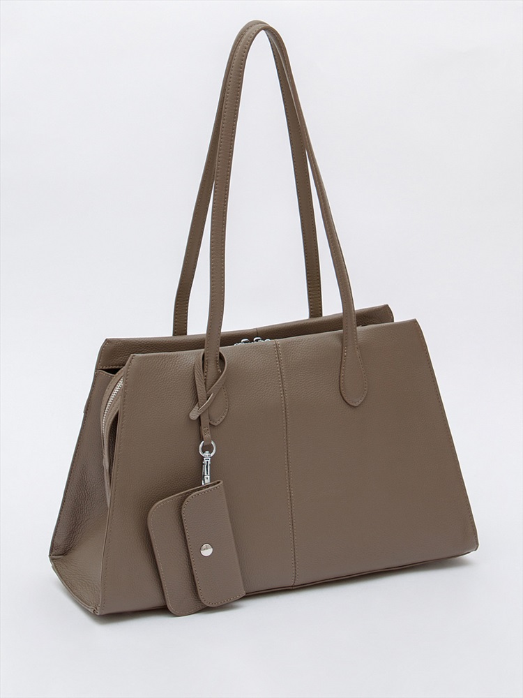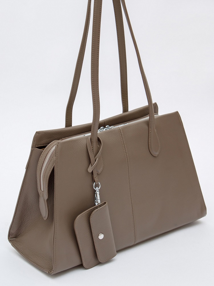 Вместительная сумка, выполнена из натуральной кожи. Дополнена серебристой фурнитурой. Данная модель закрывается на молнию, носится в руке за встроенные ручки. Или на плече. Каркас полужесткий. На дне предусмотрены ножки. В комплекте имеется съемный кошелек.