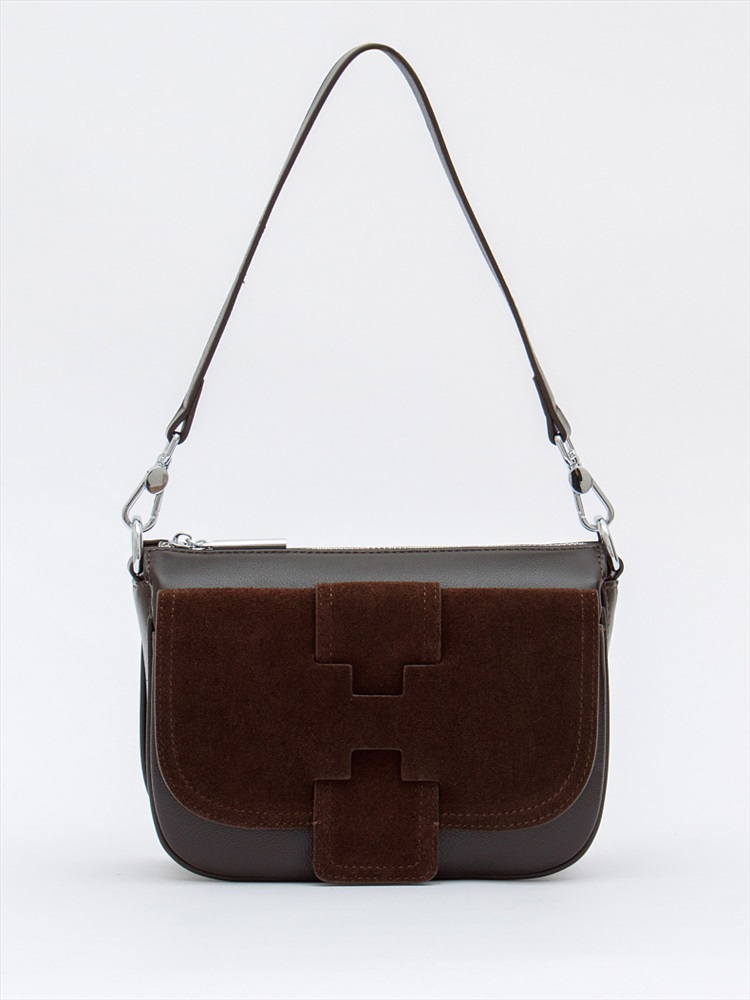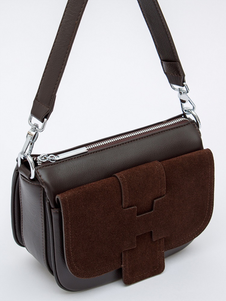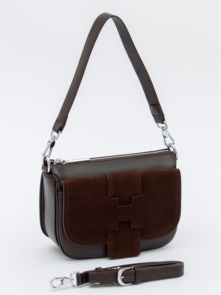 Длина (см): 19 Высота (см): 16 Вес (г): 500 Бренд: Polina&Eiterou Материал: Замша, Натуральная кожа Сумка кросс-боди, выполнена из натуральной кожи и замши. Дополнена серебристой фурнитурой. Данная модель закрывается на молнию. Каркас полужесткий. Носится в руке за съемную ручку или через плечо. В комплекте имеется съемный ремень с регулировкой длины. Внутри: подкладочная ткань, на боковых частях карман на молнии и открытый. Снаружи: под общей молнией два открытых отдела и один на молнии. На задней части карман на молнии. На передней карман под клапаном. Комментарии к товару