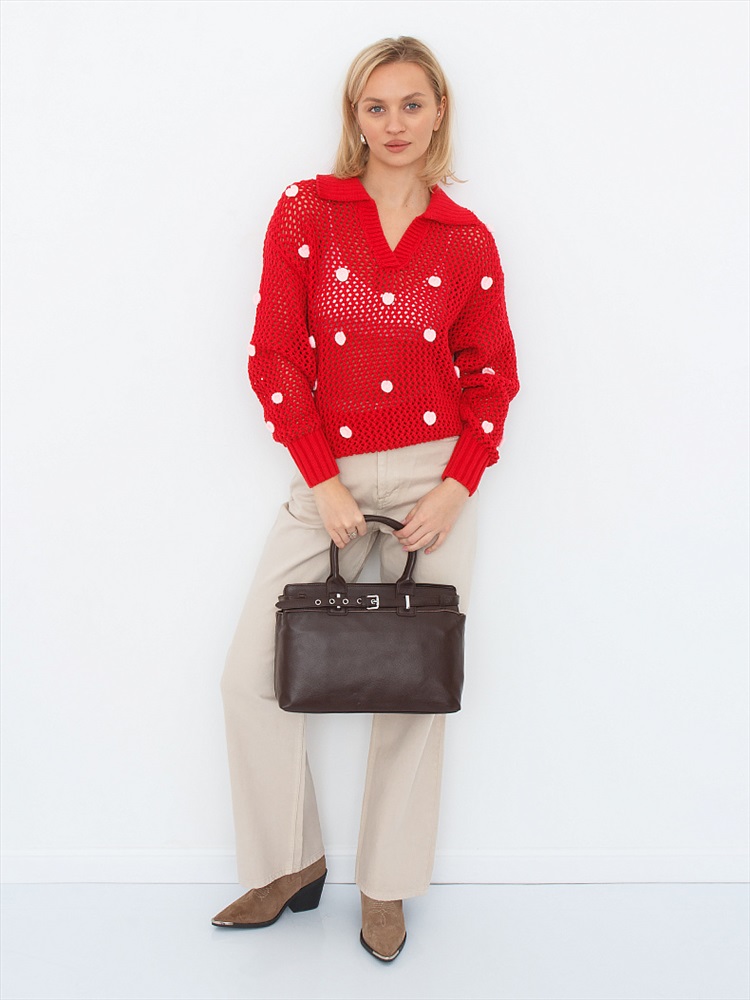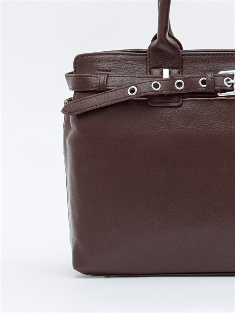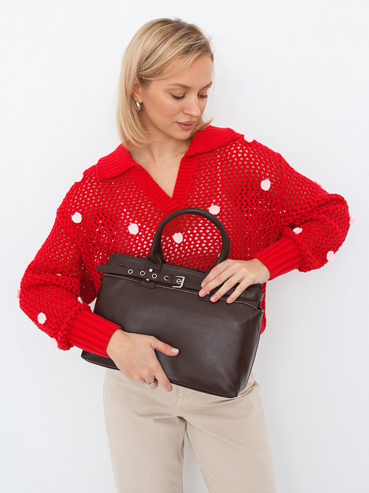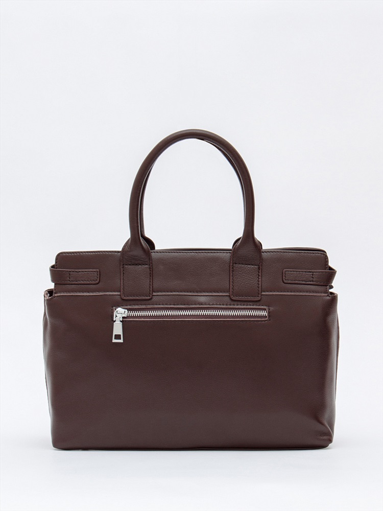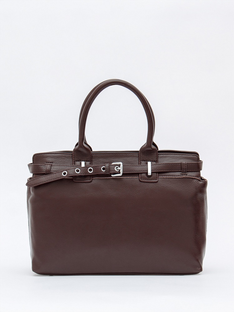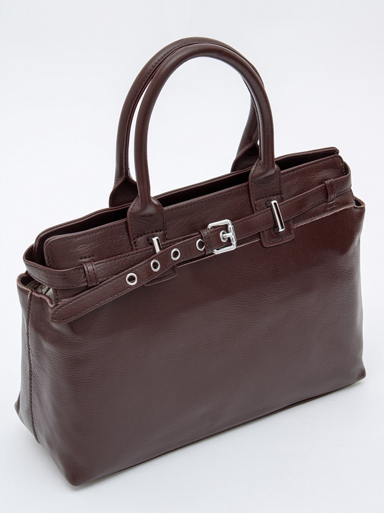 Сумка-портфель, выполнена из кожи. Декорирована ремнем на корпусе. Дополнена серебристой фурнитурой. Данная модель закрывается на молнию. Каркас полужесткий. Носится в руке за встроенные ручки или на плече. В комплекте имеется съемный ремень с регулировкой длины. На дне предусмотрены ножки.