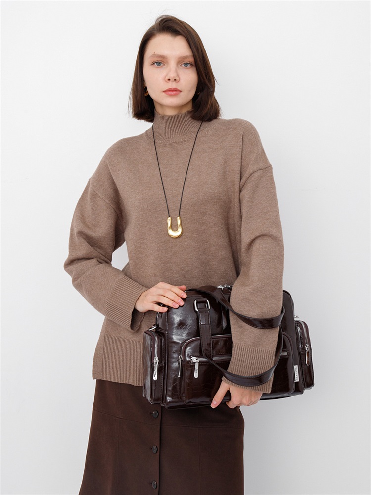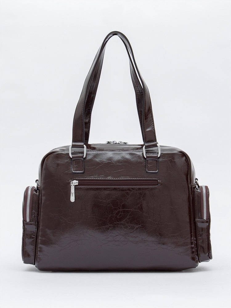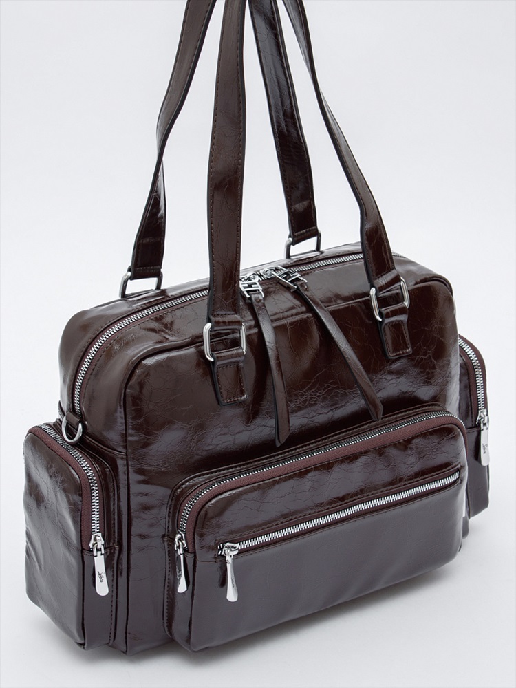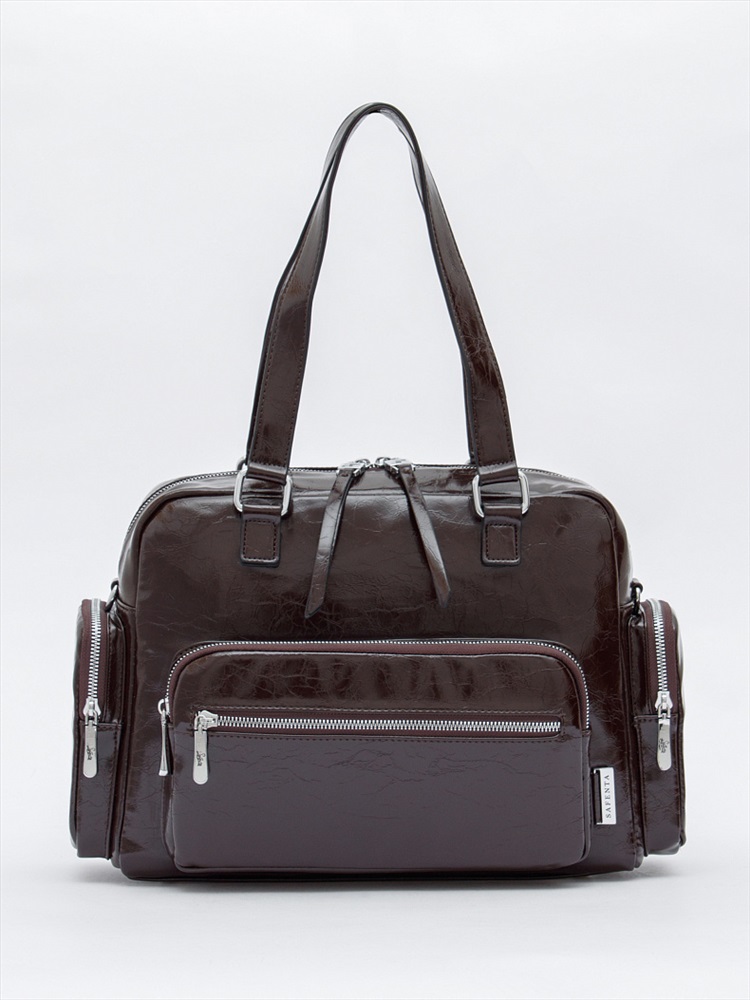Функциональная сумка, выполнена из экокожи. Дополнена серебристой фурнитурой. Данная модель закрывается на молнию. Каркас полужесткий. Носится в руке за встроенные удлиненные ручки, или на плече. В комплекте имеется съемный ремень с регулировкой длины.