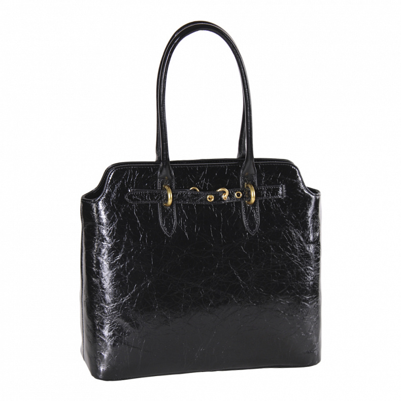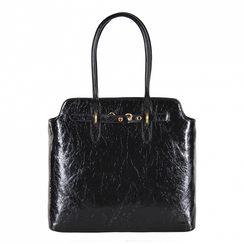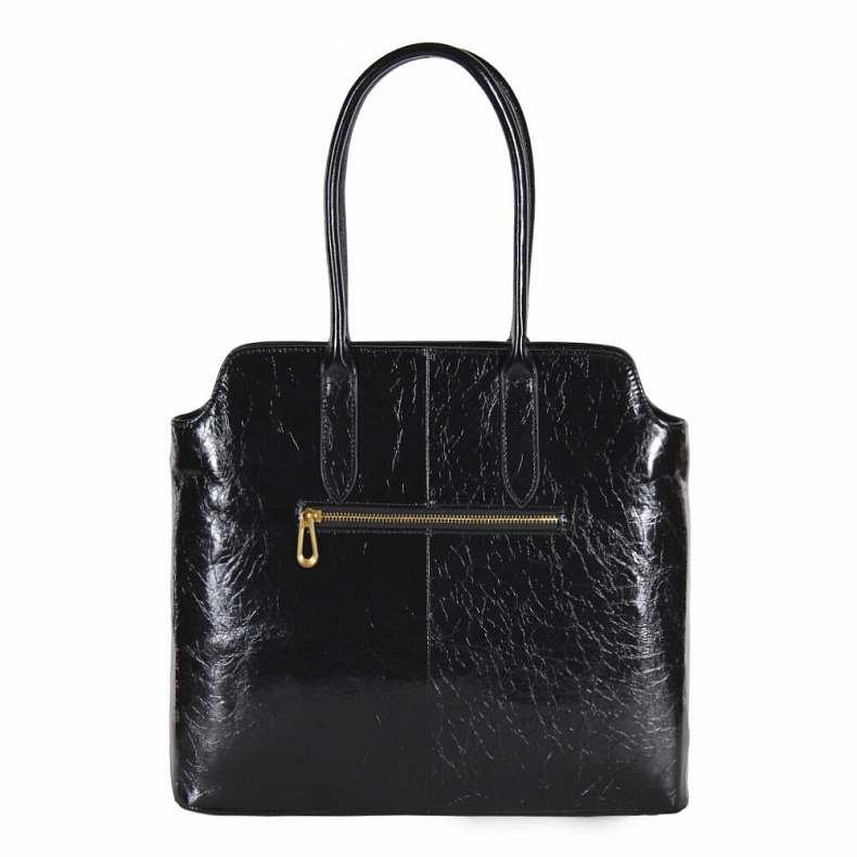 Вместительная модель выполнена из натуральной лаковой кожи. Дополнена золотистой фурнитурой. Данная модель закрывается на молнию, носится в руке. Каркас жесткий.