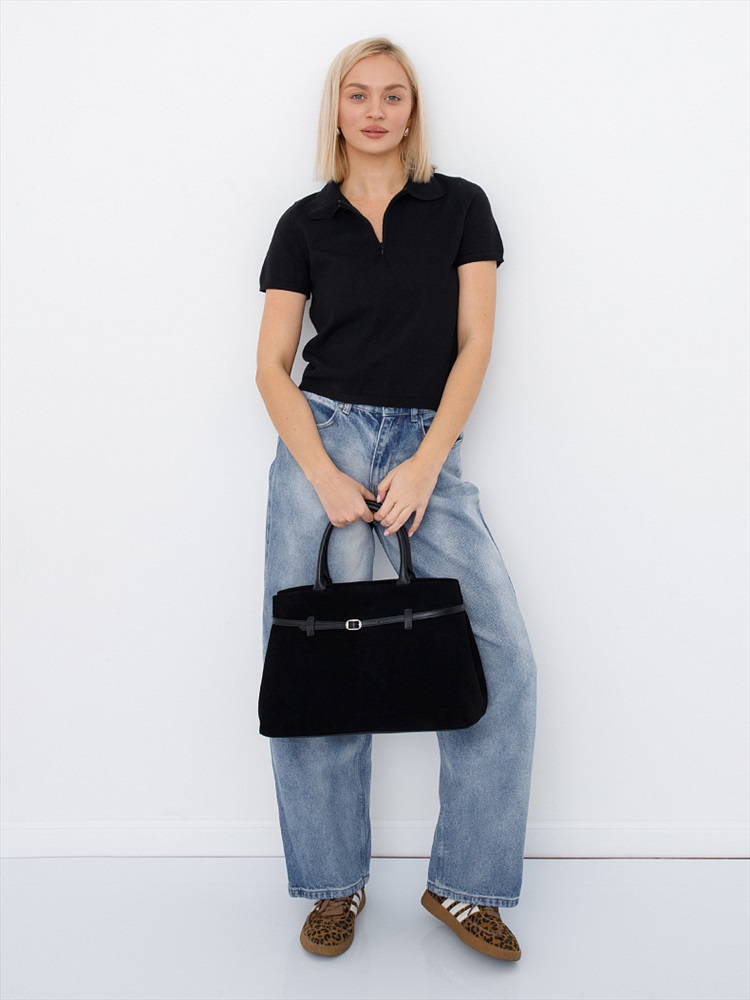 Длина (см): 37 Высота (см): 26 Вес (г): 850 Бренд: Velina Fabbiano-Safenta Материал: Замша Стильная модель, выполнена из натуральной замши. Дополнена серебристой фурнитурой. Декорирована ремнем на корпусе. Основной отдел закрывается на молнию. Сумка носится в руке за строенные ручки или на плече, в комплекте имеется съемный ремень с регулировкой длины. Каркас мягкий. По бокам имеются расширители. Внутри: подкладочная ткань, на боковых стенках карман на молнии и открытый. Снаружи: основной отдел застёгивается на молнию. Комментарии к товару