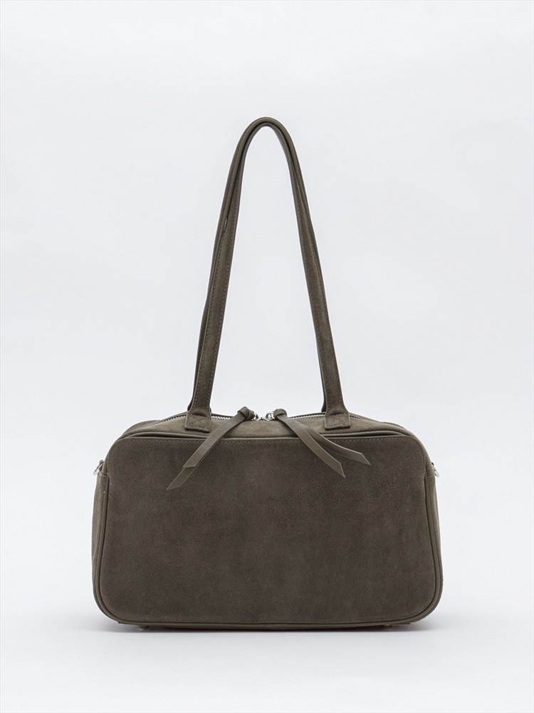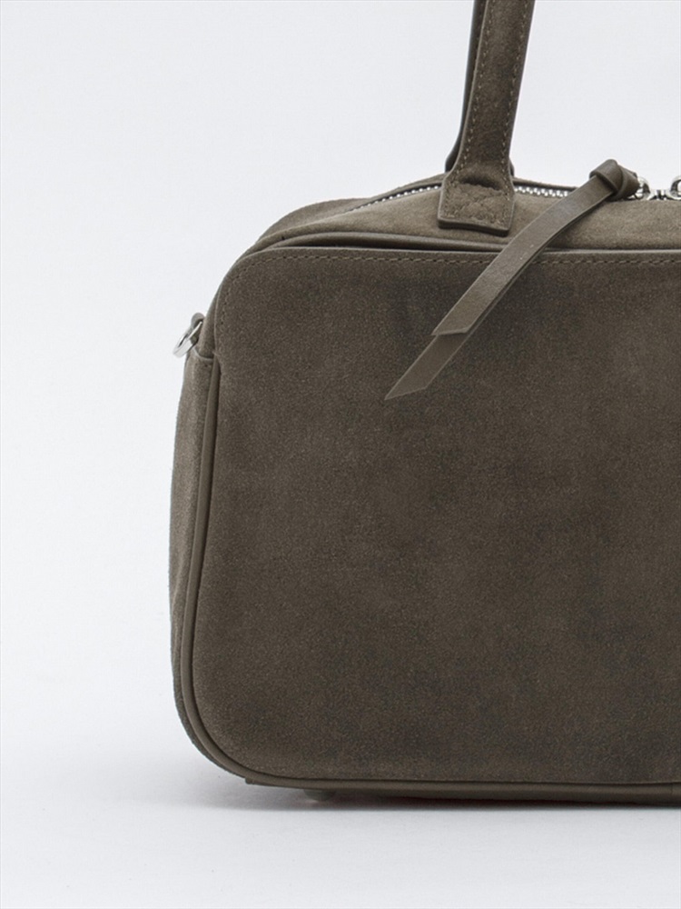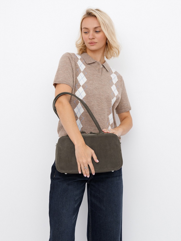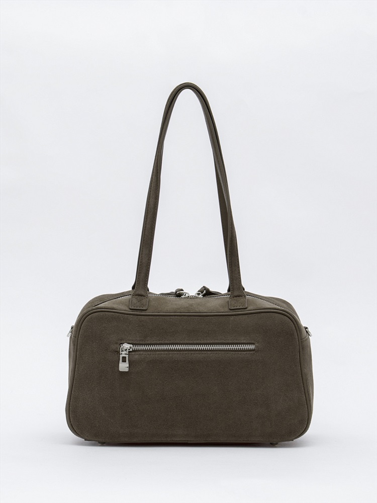 Вместительная модель, выполнена из замши. Дополнена серебристой фурнитурой. Данная модель закрывается на молнию. Каркас полужесткий. Носится в руке или на плече. В комплекте имеется съемный ремень с регулировкой длины. На дне предусмотрены ножки.