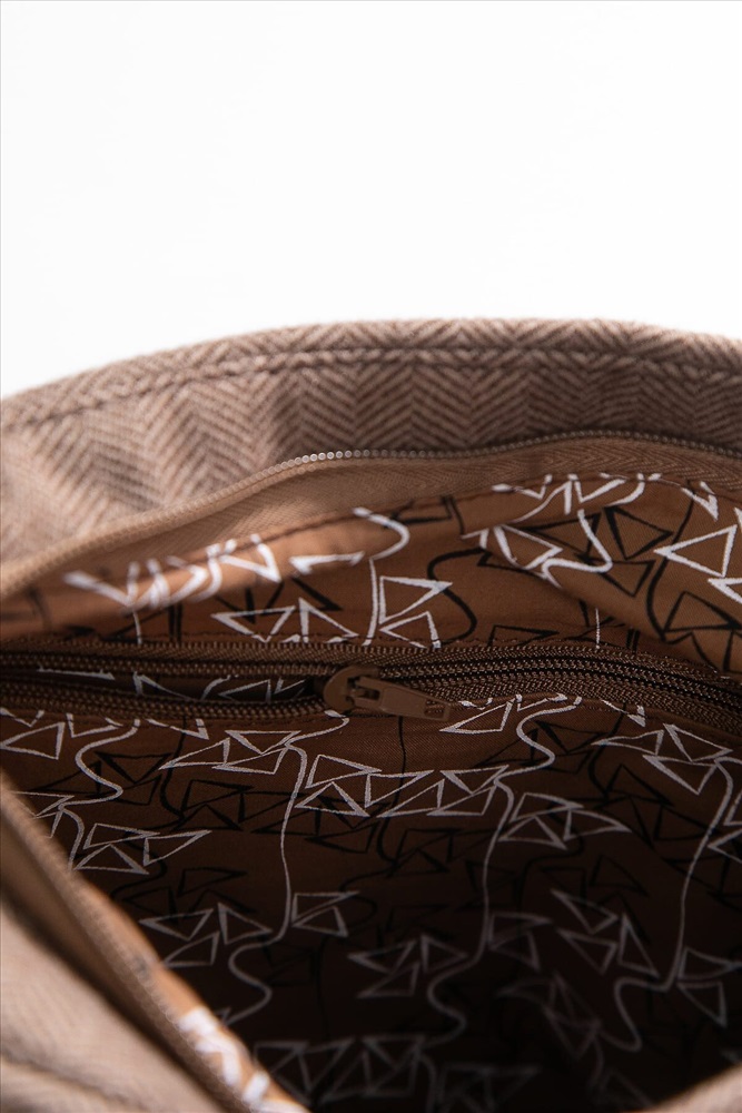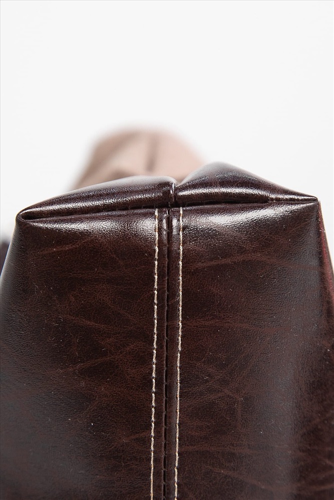 Состав : 100% полиэстер Материал : искусственная кожа и костюмная ткань под драп Цвет : коричневый Принт : мелкая ёлочка на костюмном драпе, а искусственная кожа с эффектом лака Вид застежки : молния
