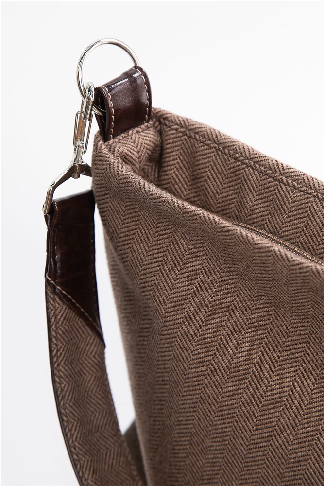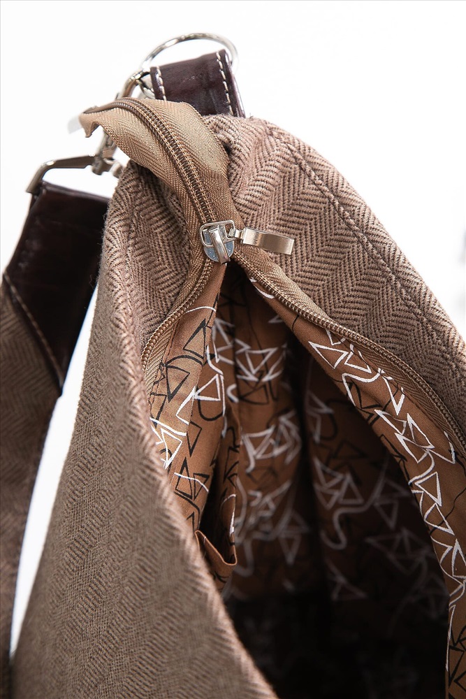Декоративные строчки, выполненные в двух оттенках ниток, подчеркивают высокое качество и внимание к деталям. Особое внимание стоит уделить двусторонней ручке: углы из искусственной кожи, настроченные на костюмный драп, превращают её в настоящий декоративный элемент. Ручка крепится на съёмных, вращающихся карабинах и соединяется с шопером на кольца, что добавляет дополнительный комфорт.
