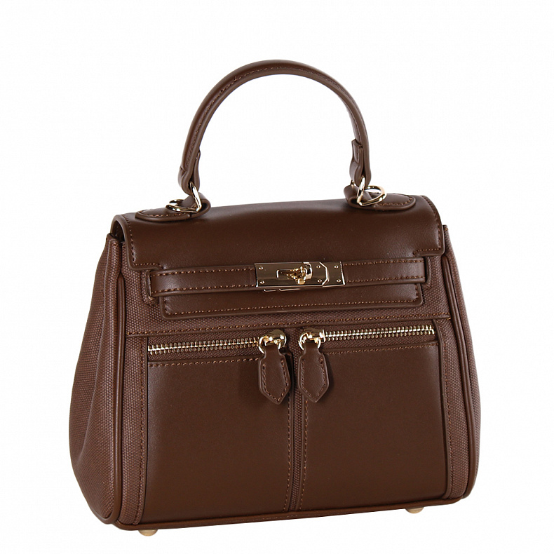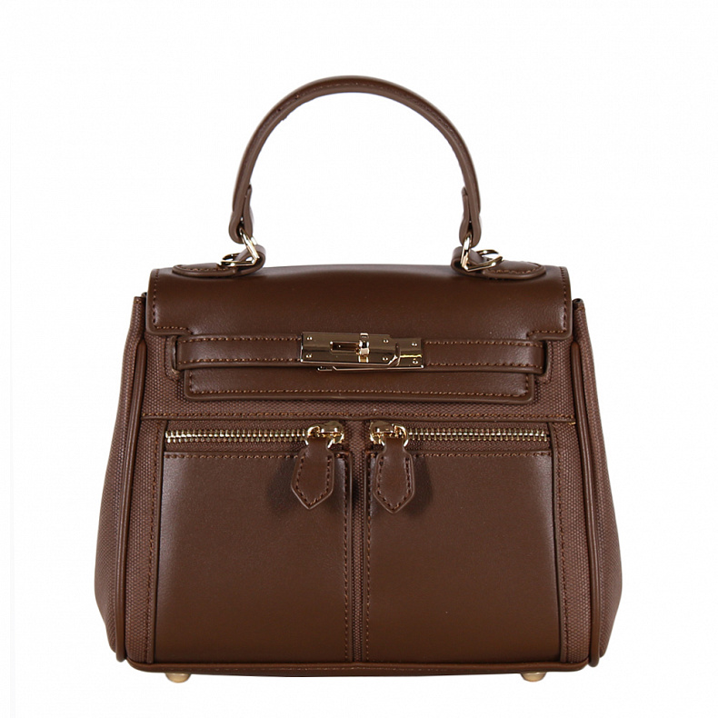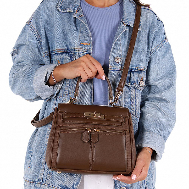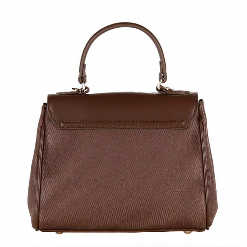 Сумка-сэтчел, выполнена из экокожи В размере мини. Декорирована эффектной застежкой на передней части. Дополнена золотистой фурнитурой. Данная модель закрывается на клапан. Каркас полужесткий. Носится в руке за встроенную ручку или на плече. В комплекте есть ремень с регулировкой длины. На дне предусмотрены ножки.