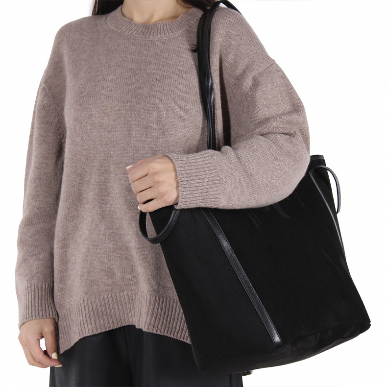 Вместительная модель, выполнена из экозамши. Данная модель открытая. Каркас полужесткий. Носится в руке за длинную ручку.