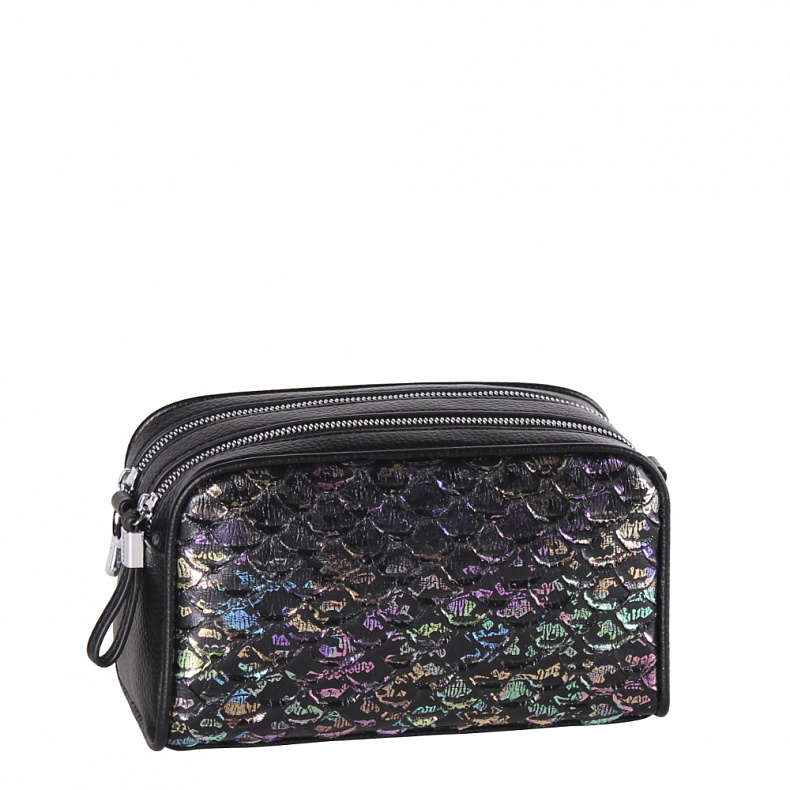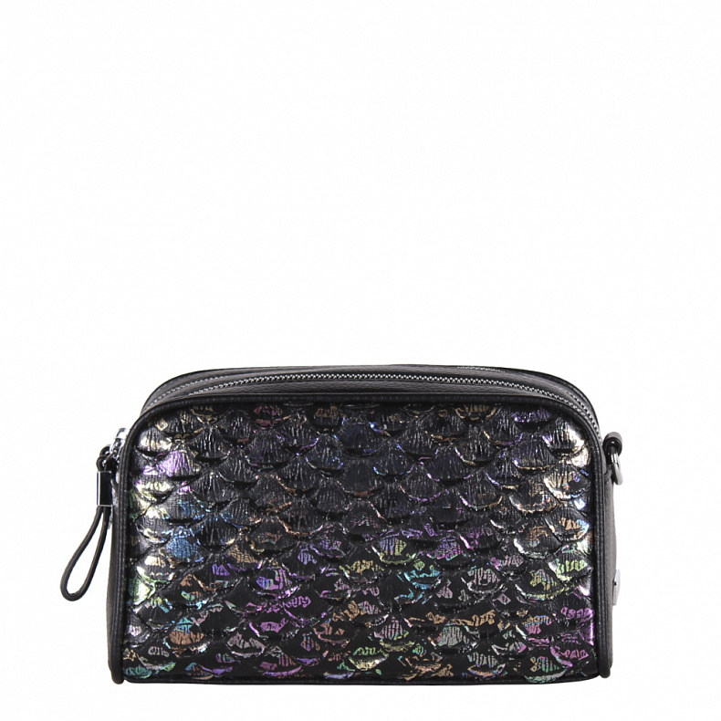 Материал: Экокожа Модель кросс-боди, выполнена из экокожи. Декорирована фактурой с перламутровым эффектом на передней части. Дополнена серебристой фурнитурой. Данная модель закрывается на молнии. Каркас полужесткий. В комплекте съемный ремень с регулировкой длины.
