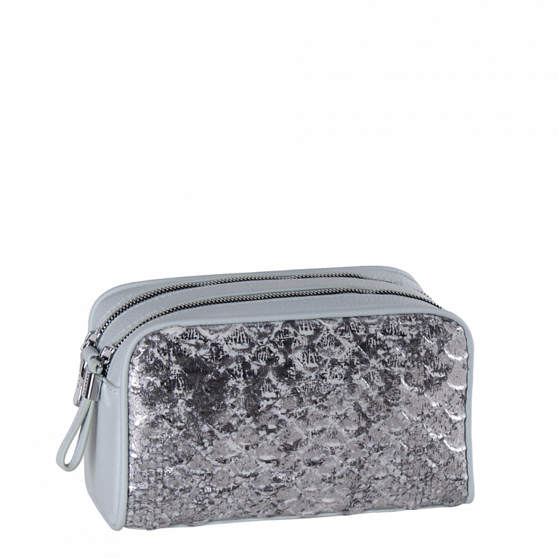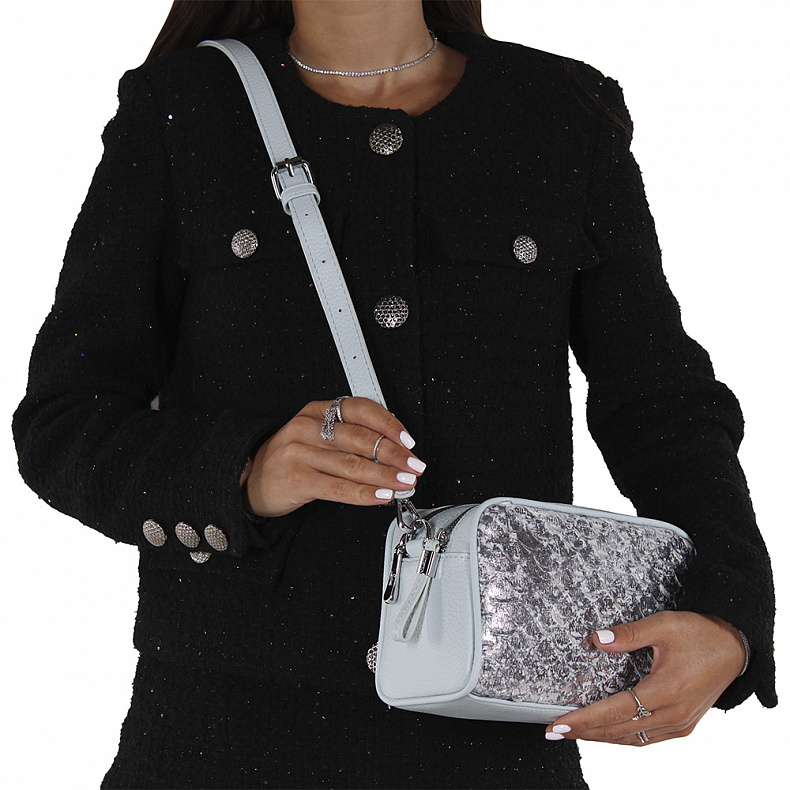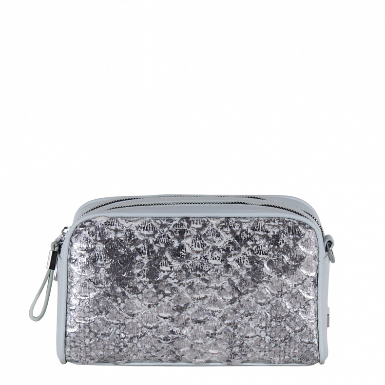 Материал: Экокожа Модель кросс-боди, выполнена из экокожи. Декорирована фактурой с перламутровым эффектом на передней части. Дополнена серебристой фурнитурой. Данная модель закрывается на молнии. Каркас полужесткий. В комплекте съемный ремень с регулировкой длины.