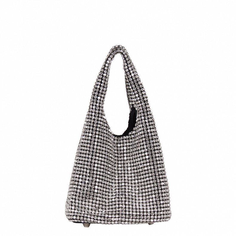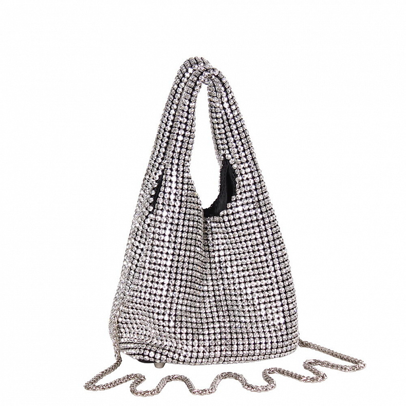 Эффектная сумка из страз, выполнена из экокожи. Дополнена серебристой фурнитурой. Данная модель закрывается на кнопку Каркас мягкий. Носится на плече за цепочку или в руке за встроенные ручки. На дне имеются ножки.