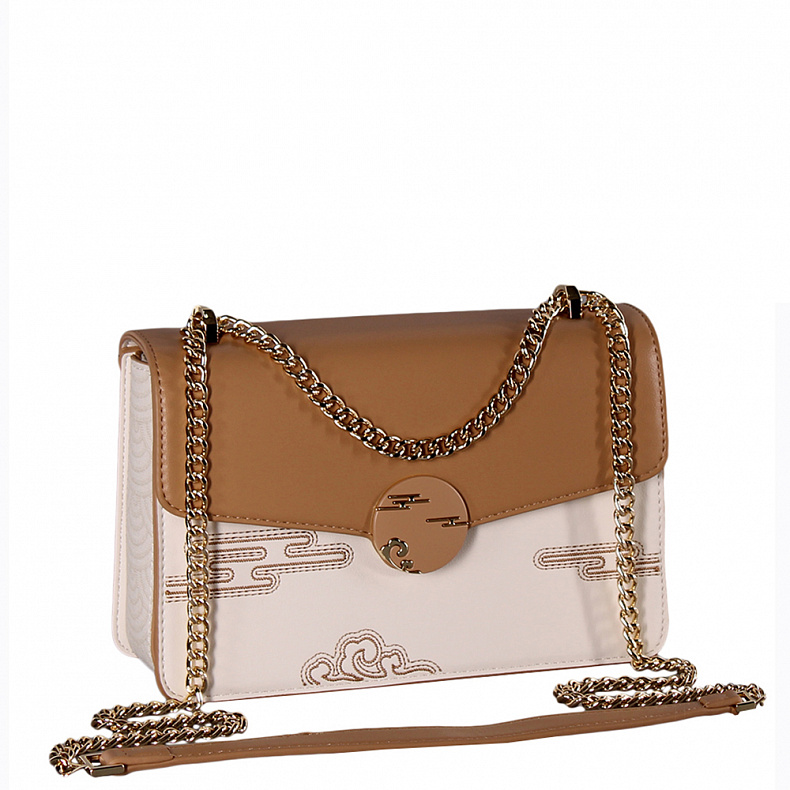 Материал: Экокожа Элегантная сумка на цепочке, выполнена из экокожи. Декорирована контрастными деталями.  Дополнена золотистой фурнитурой. Данная модель закрывается на клапан. Каркас жесткий. Носится в руке или на плече. Встроенная цепочка перетягивается.