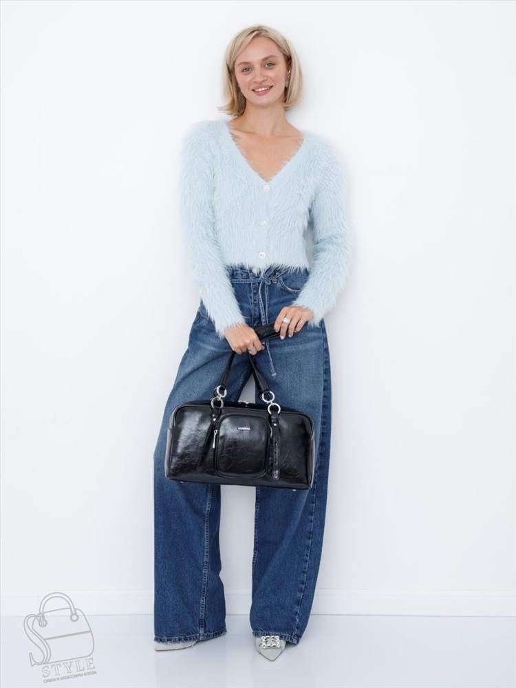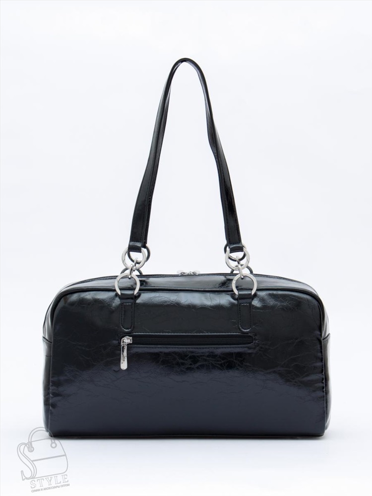 Вместительная модель, выполнена из экокожи. Дополнена серебристой фурнитурой. Данная модель закрывается на молнию, носится в руке за или на плече за встроенные ручки. Каркас полужесткий. На дне предусмотрены ножки.