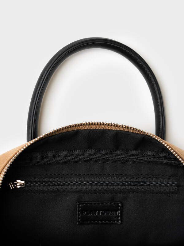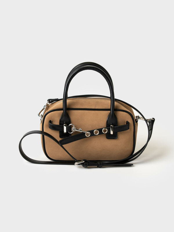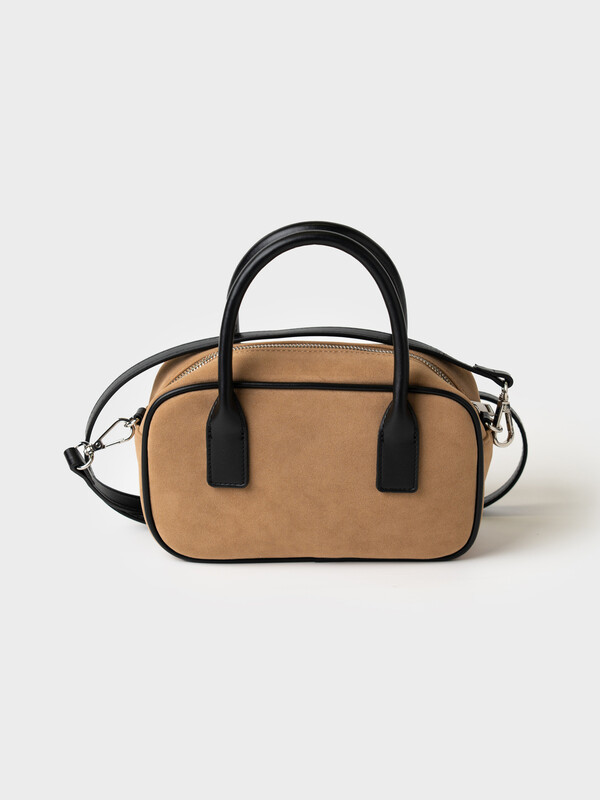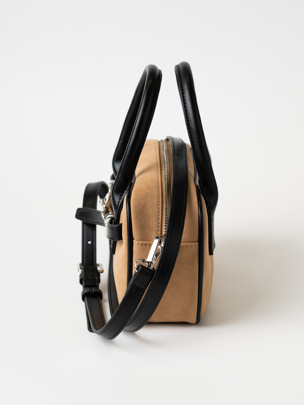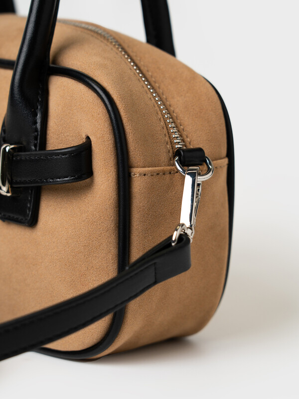 Небольшая сумка трендовой формы выполнена из искусственной замши с отделкой из искусственной кожи. Сумка имеет две ручки и плечевой регулируемый ремень. Ее можно носить как в руках, так и как кросс-боди. Сумка имеет одно отделение. Внутри имеется небольшой карман на молнии. Параметры сумки: ширина - 24см, высота - 9 см, глубина - 13 см