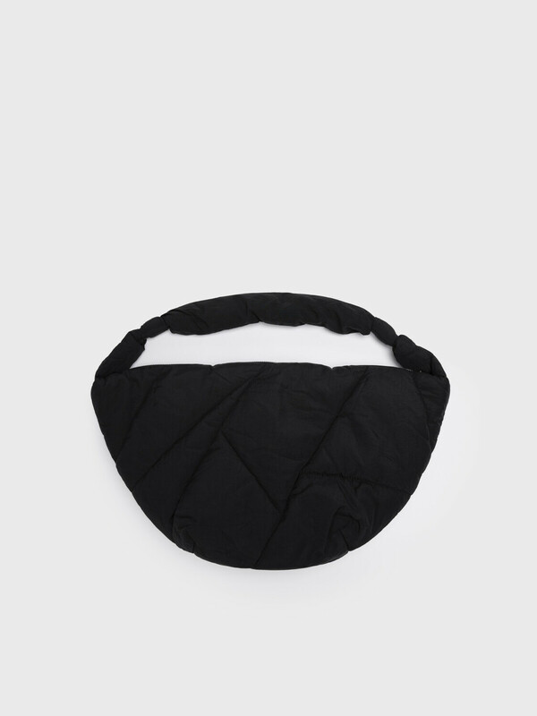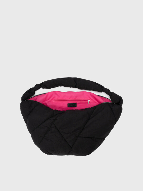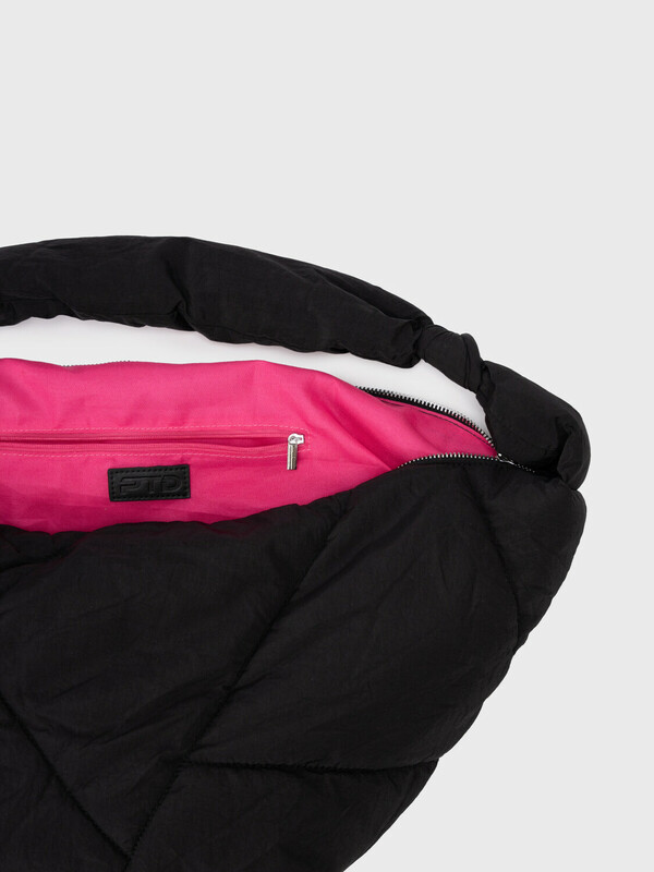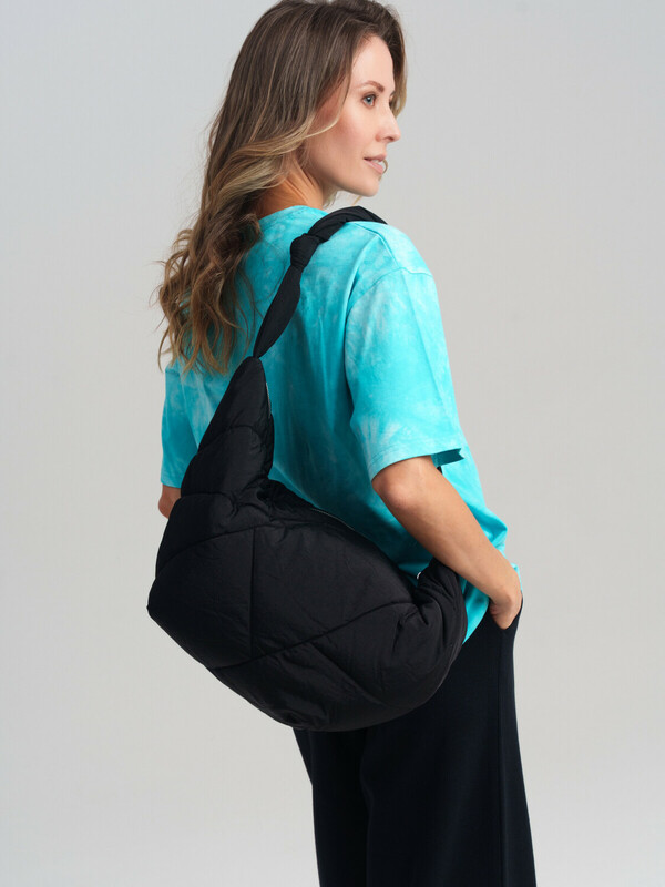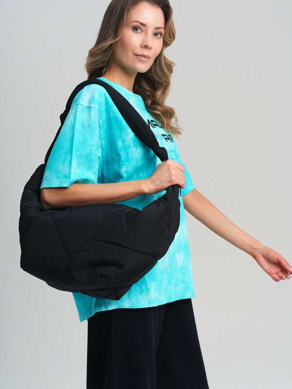 Трендовая женская дутая сумка с оригинальной простежкой. Форма полумесяц. Яркая подкладка является акцентной деталью этой модели. Сумку можно носить как на плече, так и как кросс-боди. Сумка закрывается на молнию. Внутри есть карман на молнии для документов. Параметры: высота - 28 см, ширина - 56 см, глубина - 15 см.