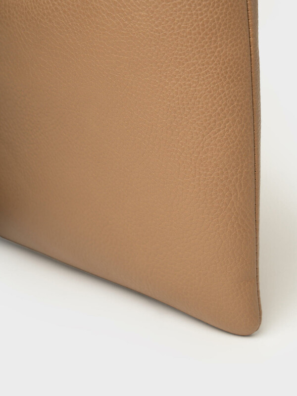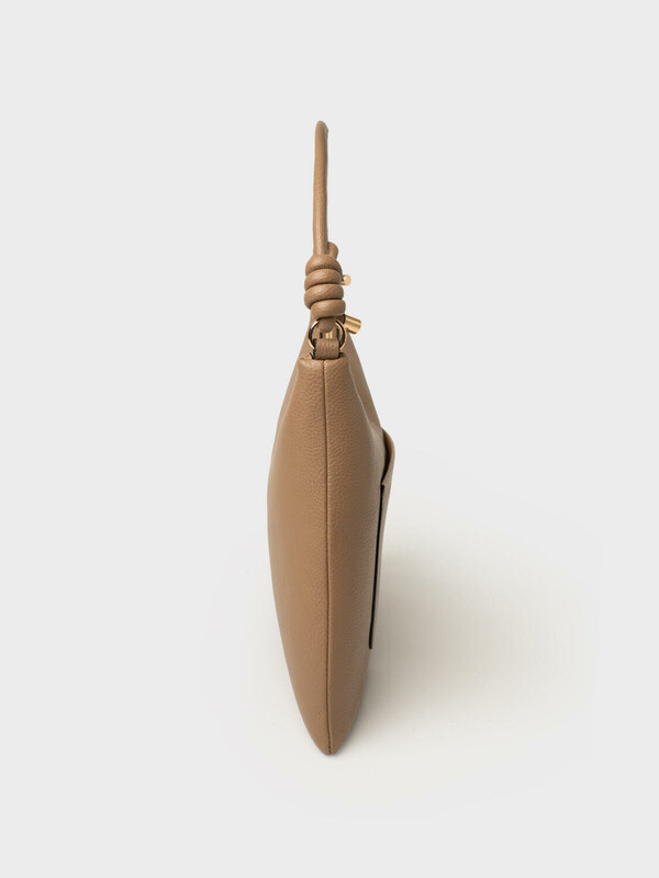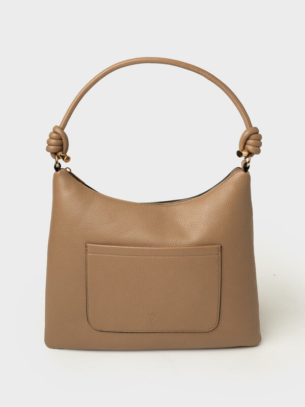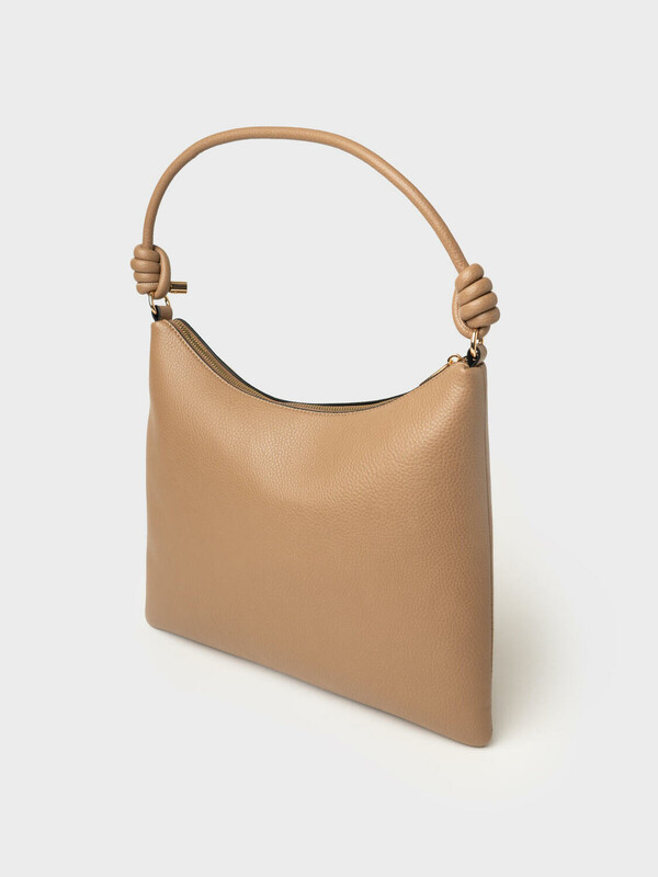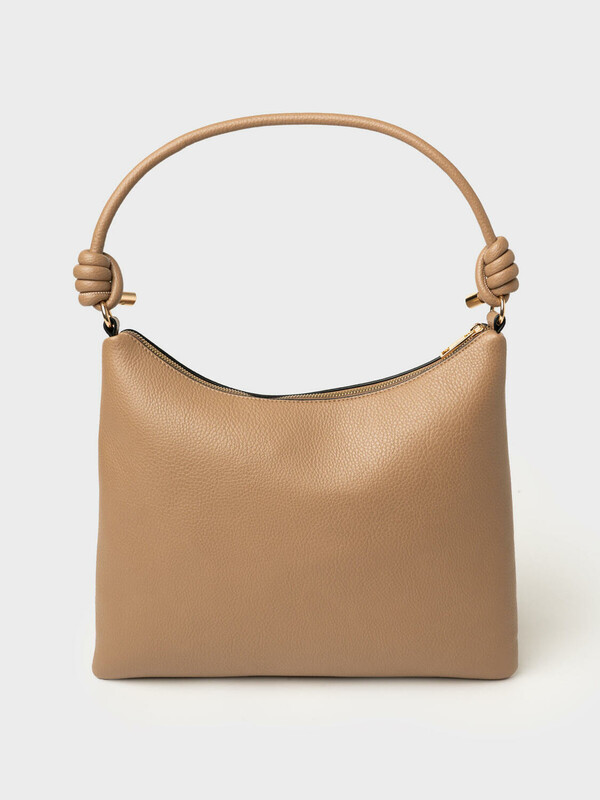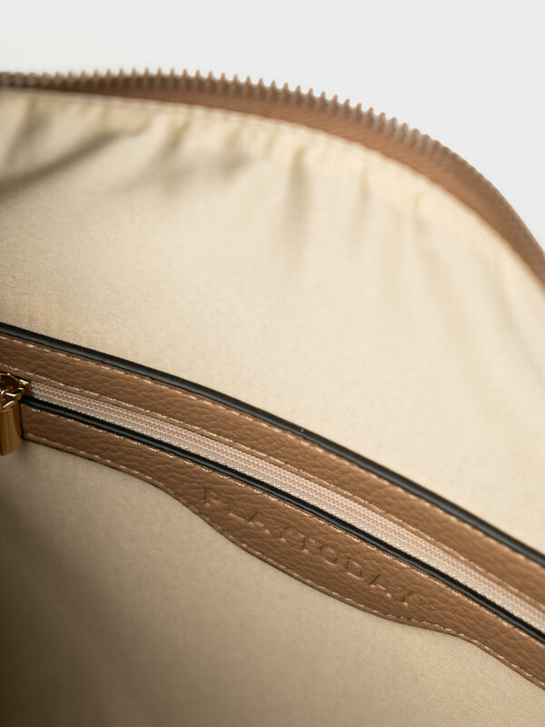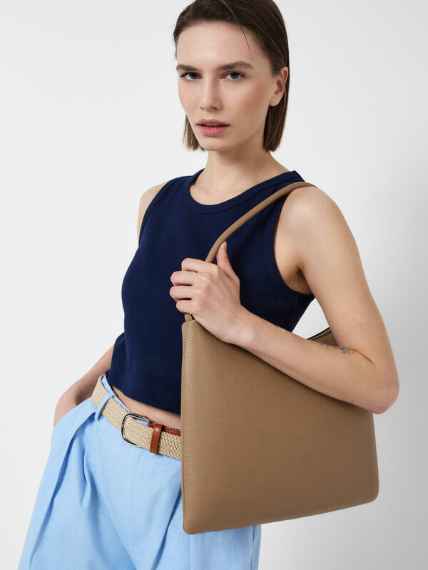 Трендовая женская сумка на плечо. Сумка выполнена из мягкой тисненной кожи темно-бежевого цвета. Сумка имеет основное отделение на молнии, сзади имеется карман для транспортной карты. Внутри есть три кармана: два открытых и один на молнии. Параметры сумки: высота - 28 см, ширина - 34 см, глубина - 2 см. В подарок идет брендированный пыльник.