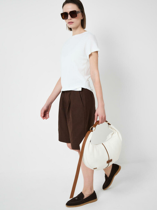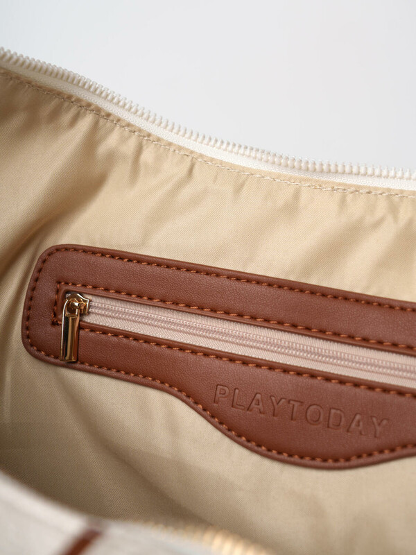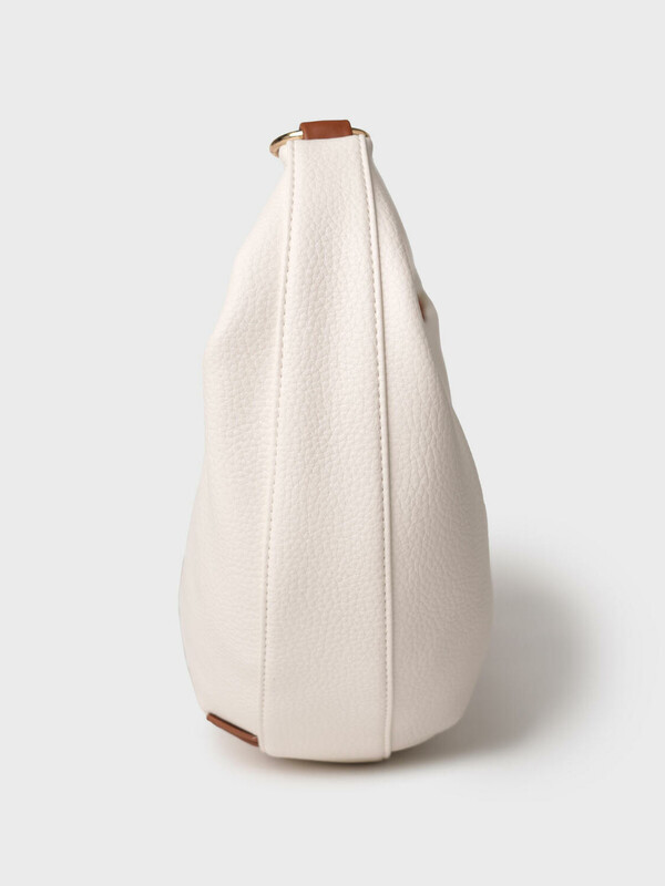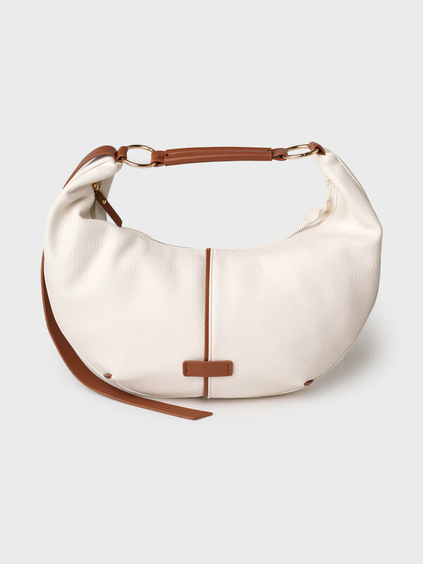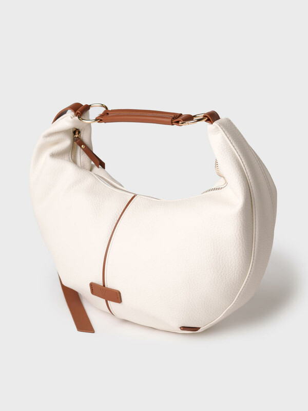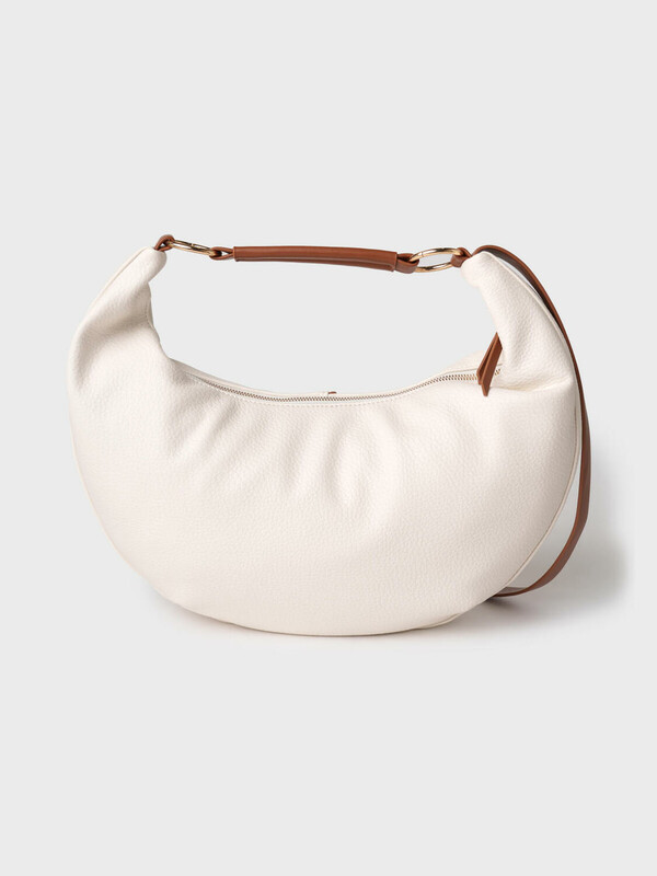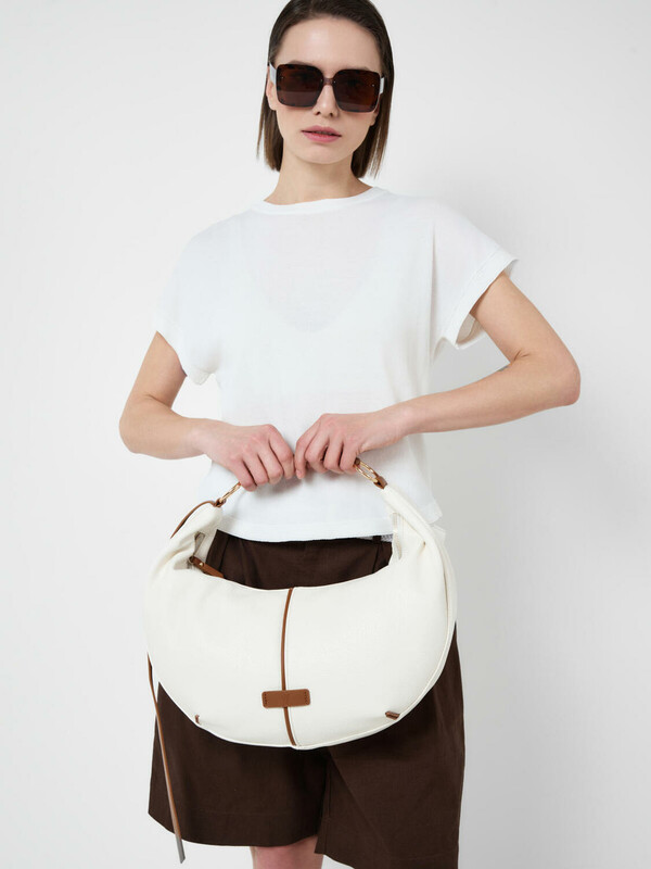 Женская сумка трендовой формы "луна". Сумка выполнена из мягкой искусственной кожи молочного цвета с отделкой ремнями карамельного цвета. Сумку можно носить на плече. Сумка имеет одно отделение на молнии. Внутри есть три кармана: два открытых и один на молнии. Параметры сумки: высота - 30 см, ширина - 44 см, глубина - 6 см. В подарок идет брендированный пыльник.
