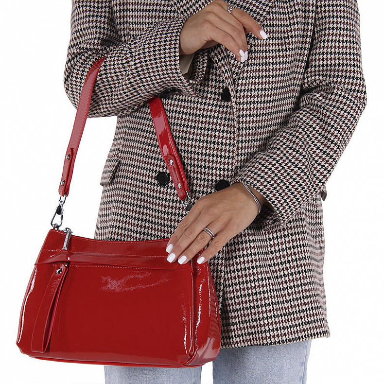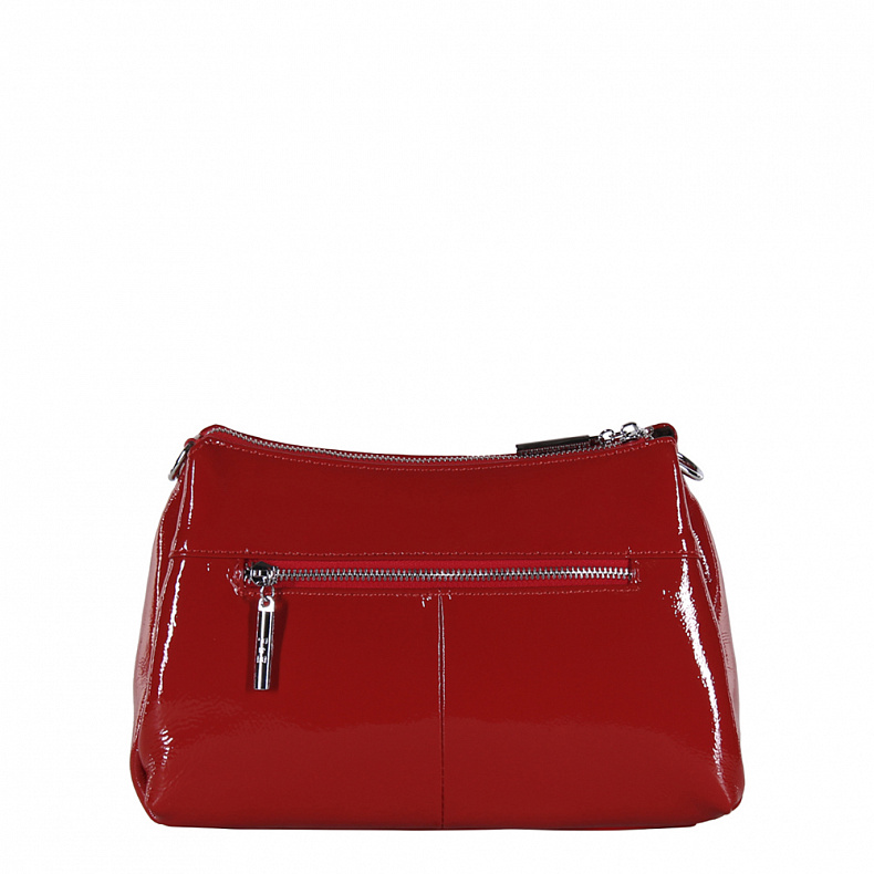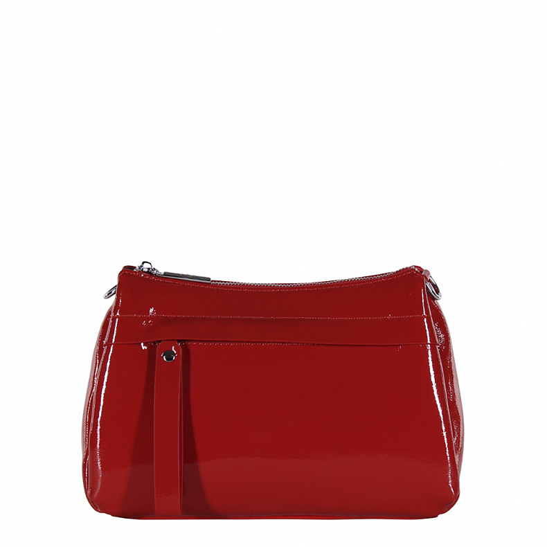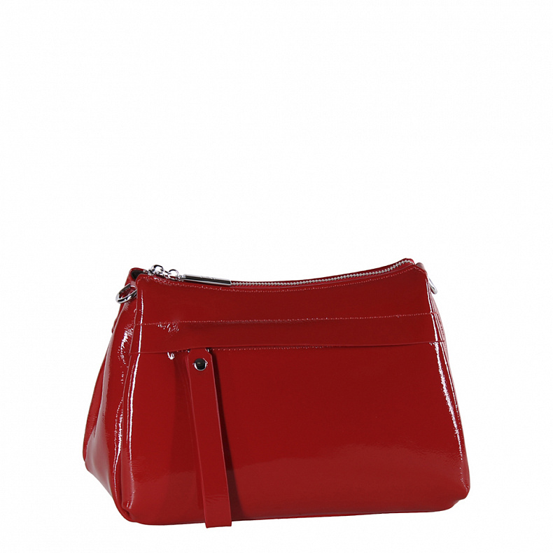 Сумка среднего размера, выполнена из натуральной лаковой кожи. Декорирована брелоком на "собачке". Дополнена серебристой фурнитурой. Данная модель закрывается на молнию. Каркас полужесткий. Носится в руке или на плече. В комплекте съемный ремень с регулировкой длины и удлиненная ручка.