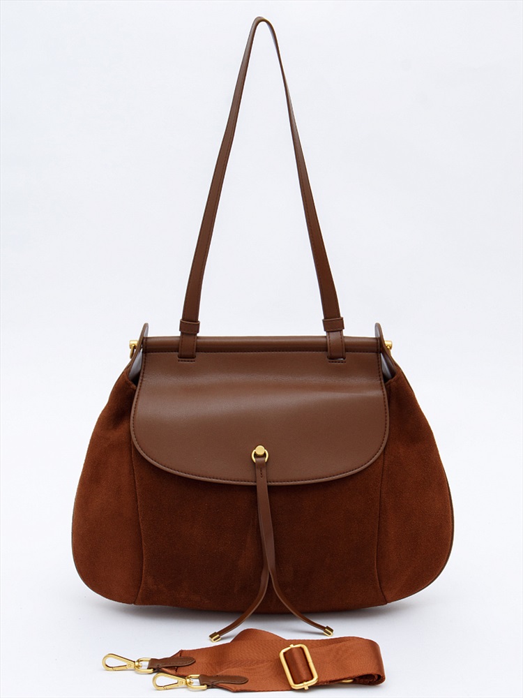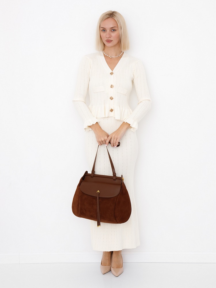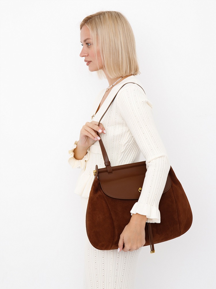 Вместительная сумка, выполнена из замши. Декорирована деталью на клапане. Дополнена золотистой фурнитурой. Данная модель закрывается на клапан, носится в руке за встроенную ручку. Или на плече, в комплекте имеется ремень-стропа с регулировкой длины. Каркас полужесткий.