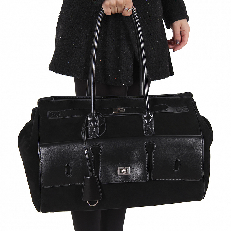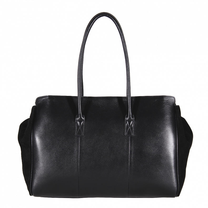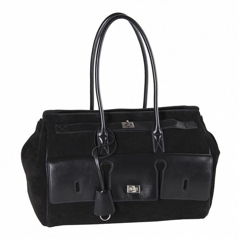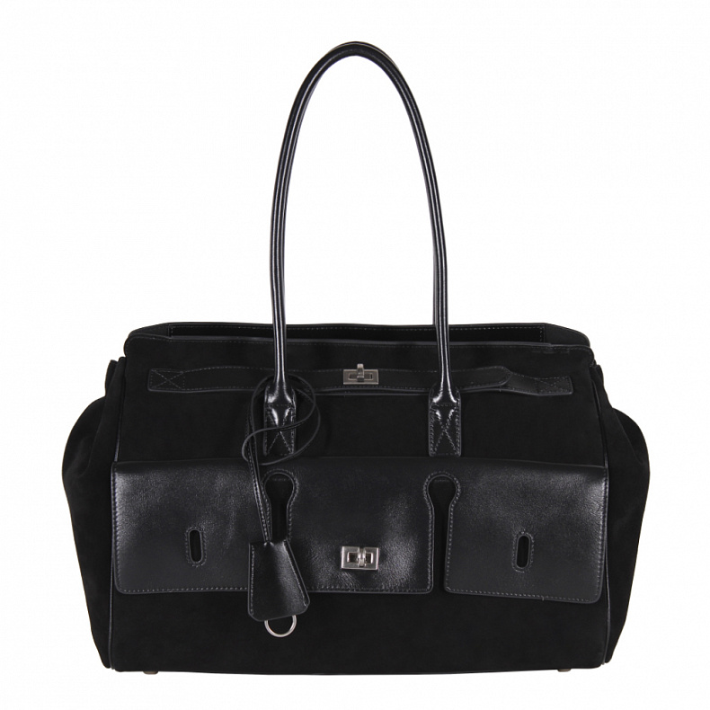 Вместительная модель, выполнена из натуральной кожи и замши. Дополнена серебристой фурнитурой. Данная модель закрывается на молнию. Каркас полужесткий. Носится в руке за встроенные ручки. На дней предусмотрены ножки.