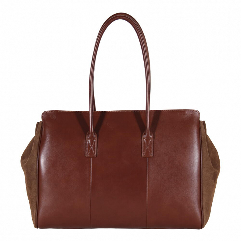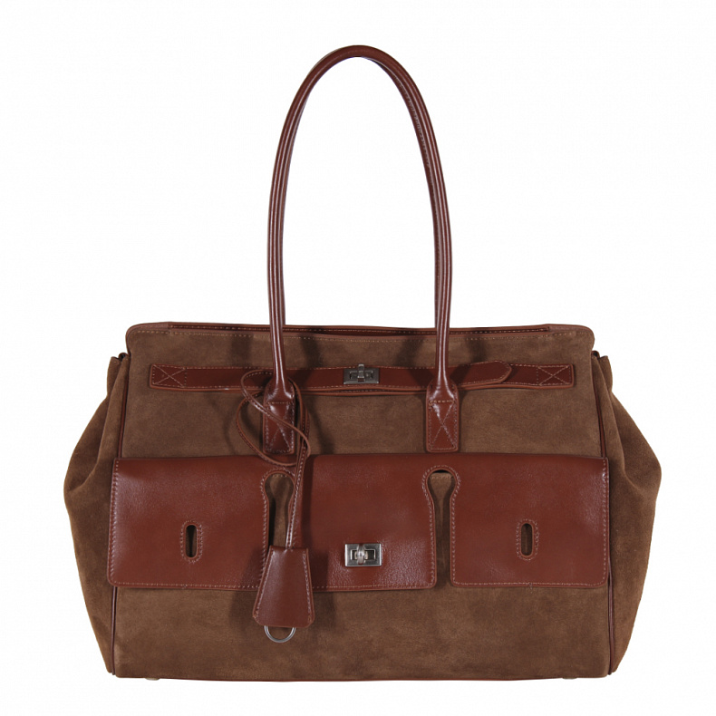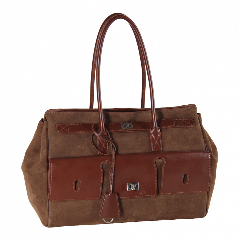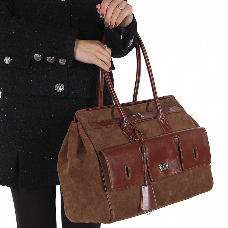 Вместительная модель, выполнена из натуральной кожи и замши. Дополнена серебристой фурнитурой. Данная модель закрывается на молнию. Каркас полужесткий. Носится в руке за встроенные ручки. На дней предусмотрены ножки.