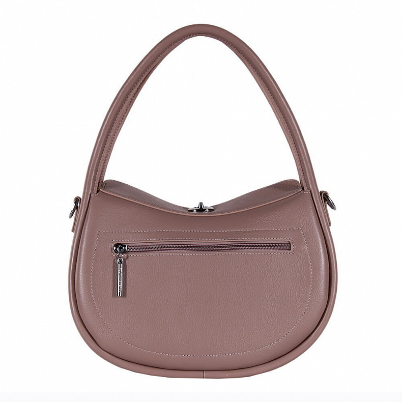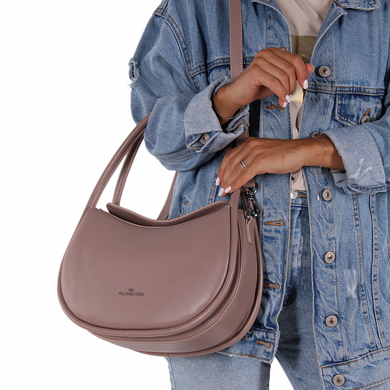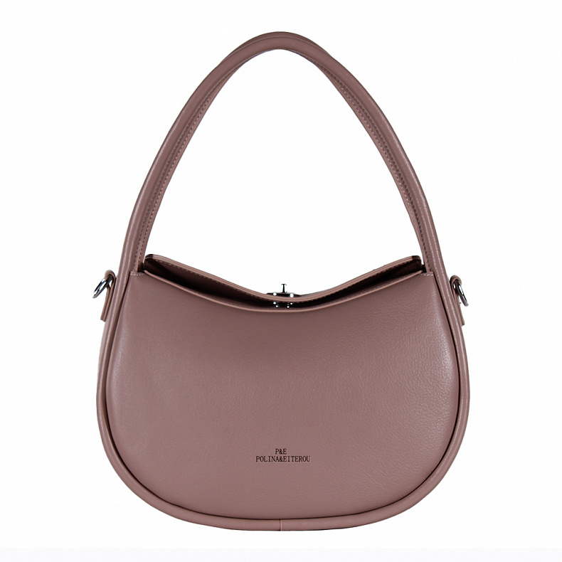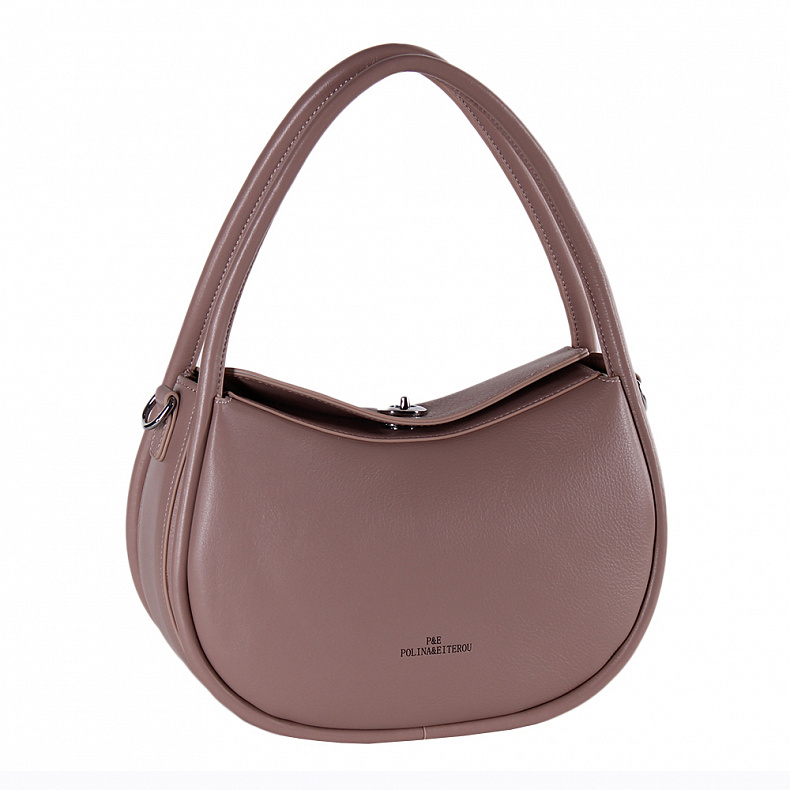 Модель в форме полумесяц, выполнена из натуральной кожи. Декорирована логотипом на передней части. Дополнена серебристой фурнитурой. Данная модель закрывается на вертушку. Каркас полужесткий. Носится в руке за встроенные ручки, которые плавно переходят из корпуса. Или на плече. В комплекте съемный ремень с регулировкой длины.