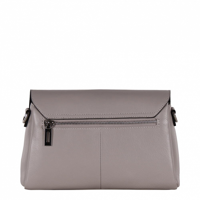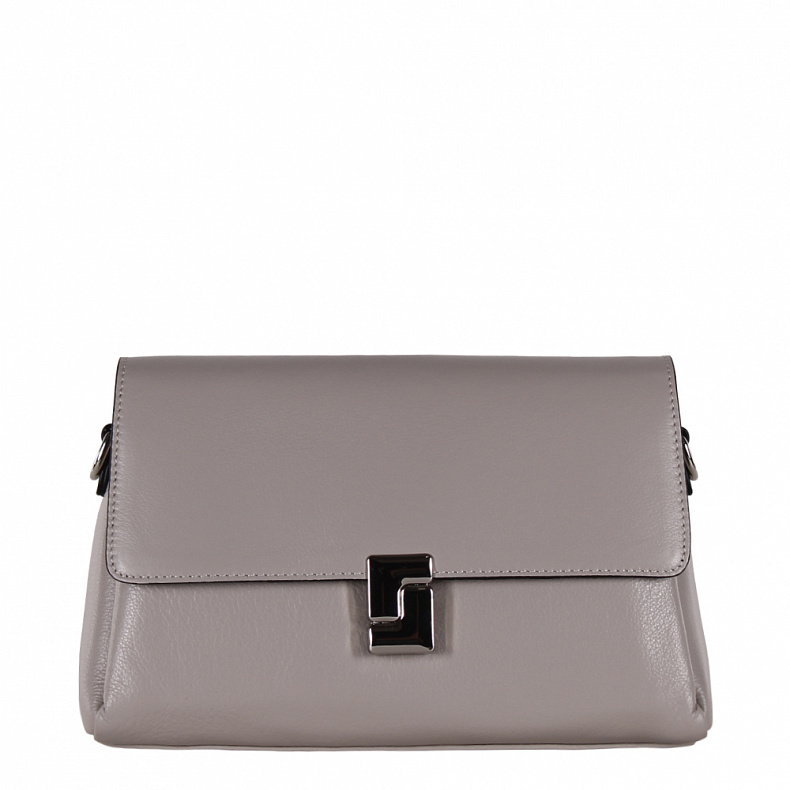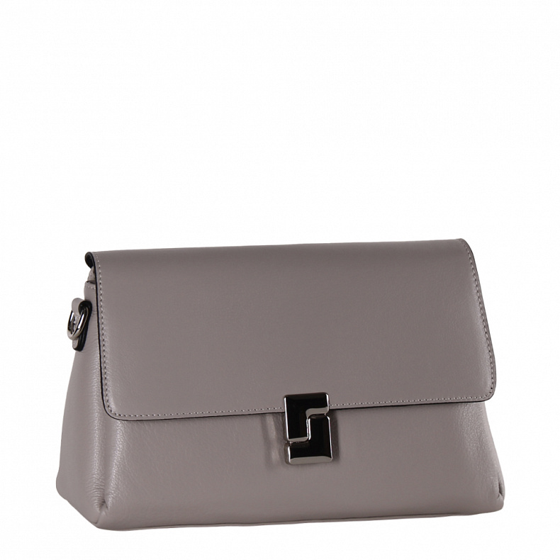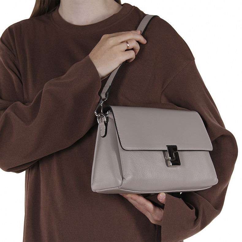 Модель кросс-боди, выполнена из натуральной кожи. Дополнена серебристой фурнитурой. Данная модель закрывается на клапан. Каркас полужесткий. Носится на плече за съемную ручку или на плече. В комплекте имеется съемный ремень с регулировкой длины.