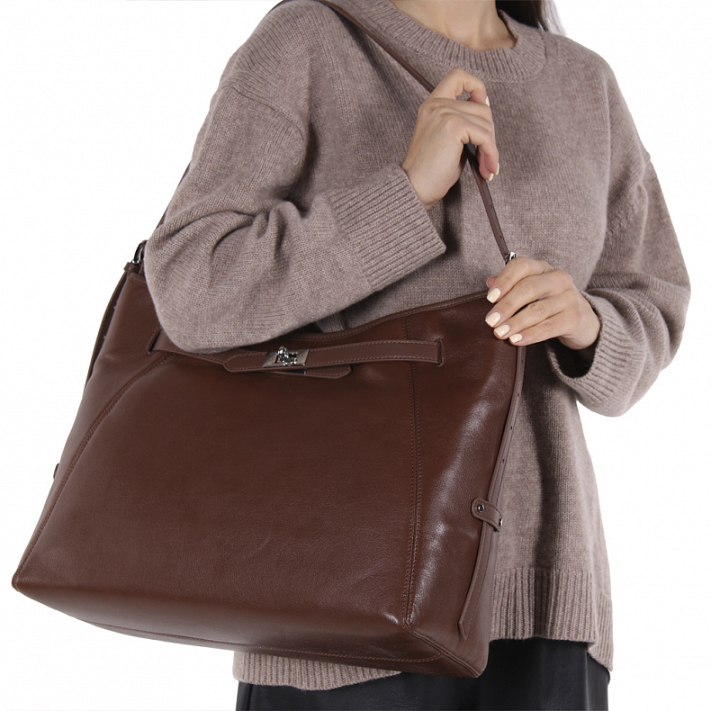 Базовая модель, выполнена из натуральной кожи. Дополнена серебристой фурнитурой и пряжкой. Данная модель закрывается на магнитную. Каркас полужесткий. Носится за плечевой ремень съемный.