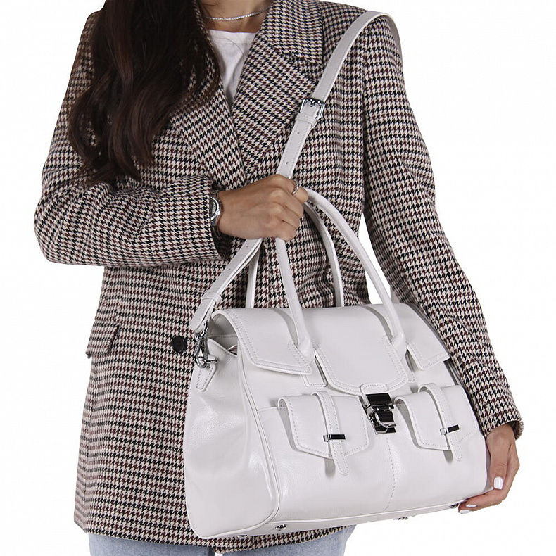 Длина (см): 33 Высота (см): 22 Вес (г): 1100 Бренд: Polina&Eiterou Материал: Натуральная кожа Вместительная модель выполнена из натуральной кожи. Дополнена серебристой фурнитурой. Данная модель закрывается на клапан. Каркас полужесткий. Носится в руке или на плече. В комплекте съемный ремень с регулировкой длины и две встроенные ручки. На дне предусмотрены ножки. Внутри: подкладочная ткань. На боковых частях карман на молнии и открытый. Снаружи: основной отдел закрывается на клапан. На задней части карман на молнии. На передней два кармана под клапанами. Комментарии к товару