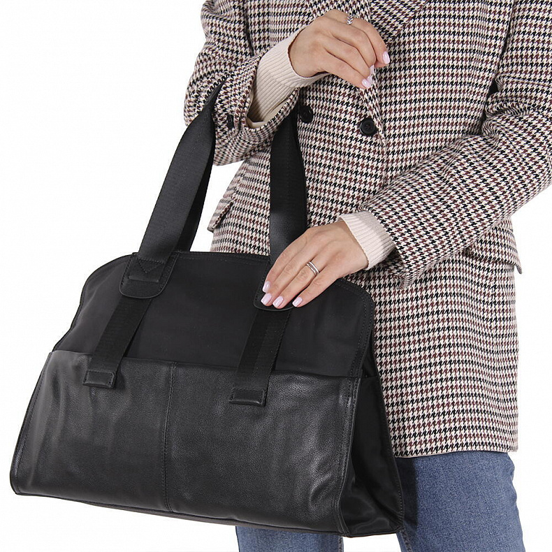 Сумка, выполнена из текстиля и натуральной кожи. Дополнена фурнитурой темное серебро. Данная модель закрывается на молнию, носится в руке или на плече. В комплекте есть ремень съемный с регулировкой длины. Каркас мягкий.