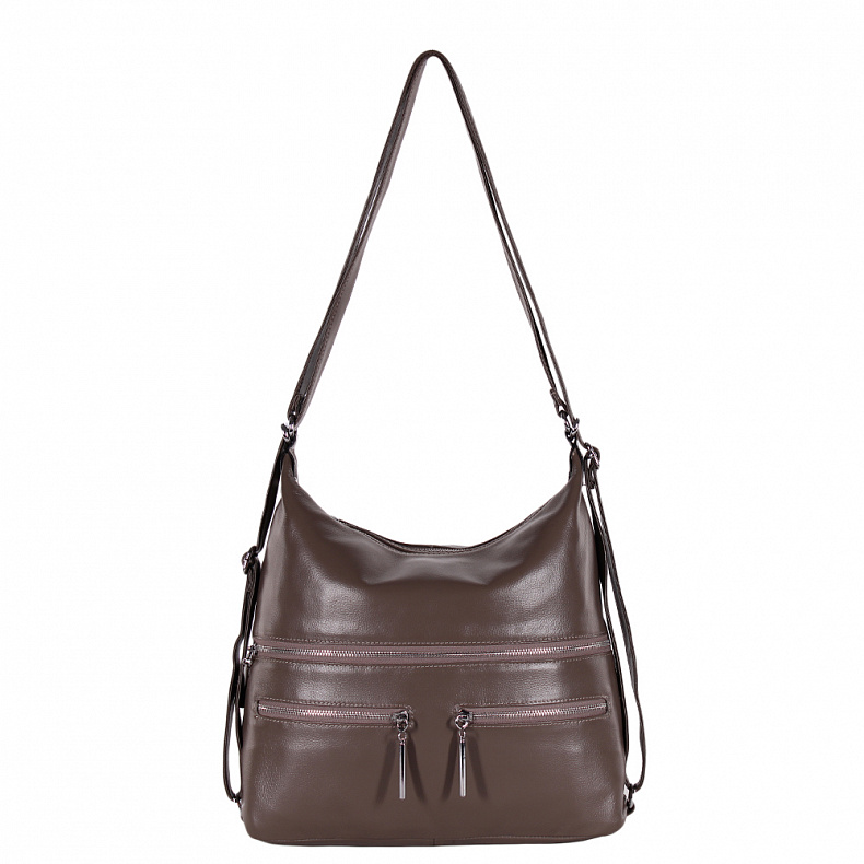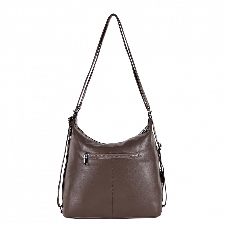Встроенные плечевые ремни позволяют применить три варианта ношения сумки: в руке, на плече, в качестве рюкзака. Цвет фурнитуры-серебристый. Ножек нет.