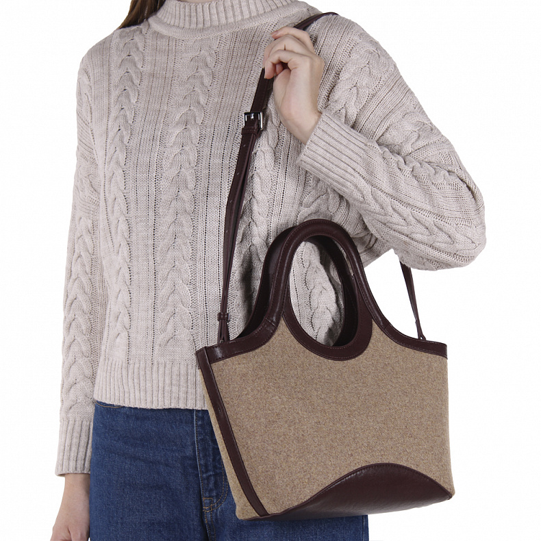 Материал: Натуральная кожа Сумка-ведро выполнена из натуральной кожи и войлока.  Данная модель носится на плече или в руке за встроенную ручку. Каркас сумки полужесткий. Дно плотное. В комплекте плечевой ремешок с регулировкой длины.