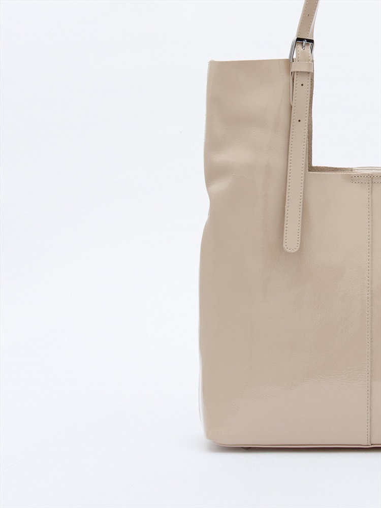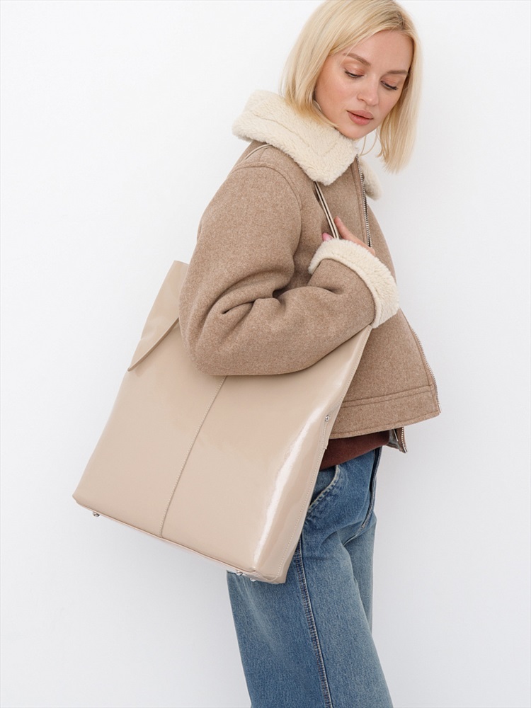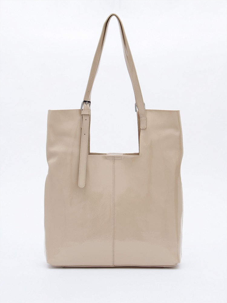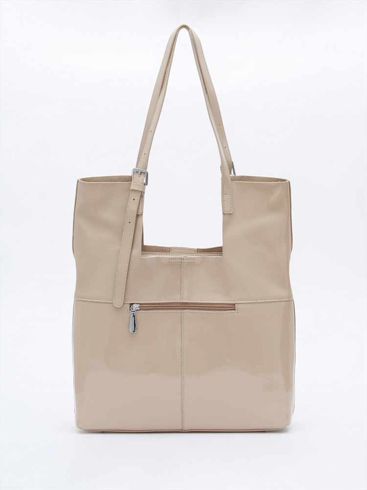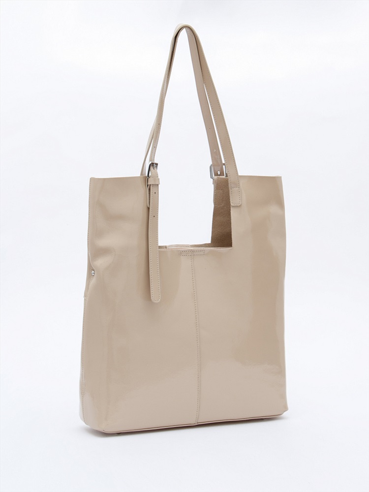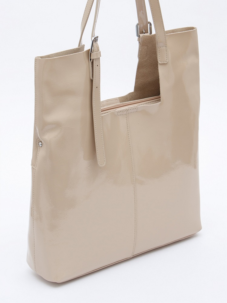 Вместительная сумка, выполнена из натуральной лаковой кожи. Дополнена серебристой фурнитурой. Данная модель закрывается на молнию. Носится в руке или на плече за встроенную ручку, которая регулируется по длине. Каркас полужесткий. На дне предусмотрены ножки.