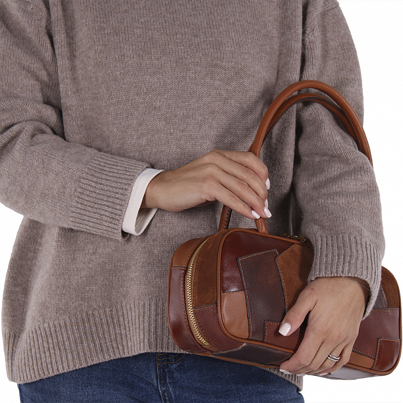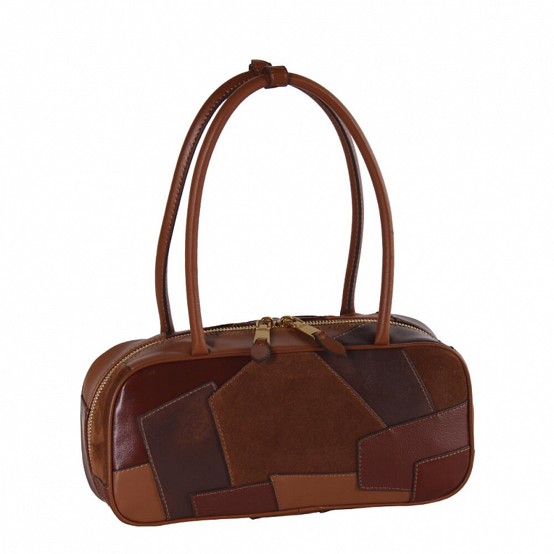 Интересная сумка, выполнена из натуральной кожи. Декорирована кусочка кожи. Дополнена золотистой фурнитурой. Данная модель закрывается на молнию, носится в руке за ручки. Каркас полужесткий.