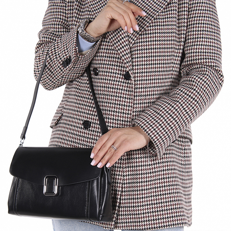 Сумка в минималистичном дизайне, выполнена из натуральной кожи. Декорирована пряжкой на клапане. Дополнена серебристой фурнитурой. Данная модель закрывается на клапан, носится в руке или на плече. Основной отдел закрывается на молнию, под молнией два открытых отдела и отдел на молнии. В комплекте ремень съемный с регулировкой длины и съемная ручка короткая. Каркас полужесткий.