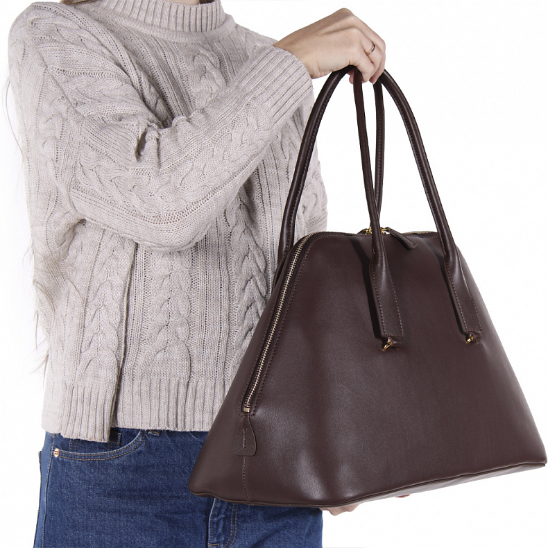 Материал: Натуральная кожа Стильная сумка тоут актуальной формы  выполнена из натуральной  кожи. Сумка полностью закрывается на молнию и имеет модную расширяющуюся к низу трапецевидную форму. Внутри у модели просторное отделение, в котором есть карман на молнии и открытый карман.