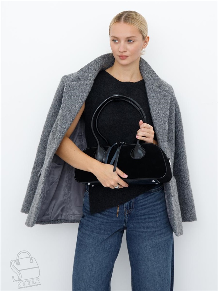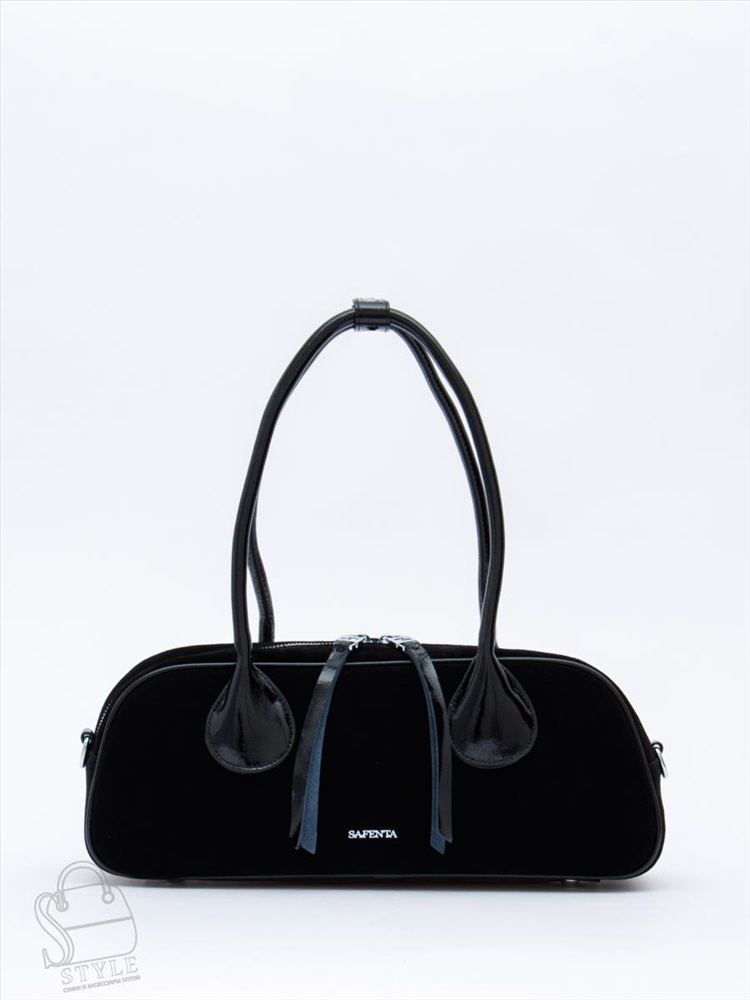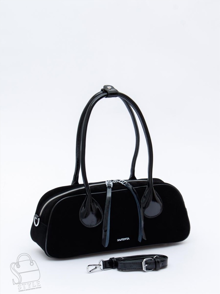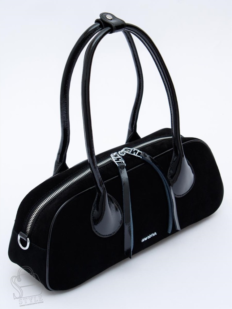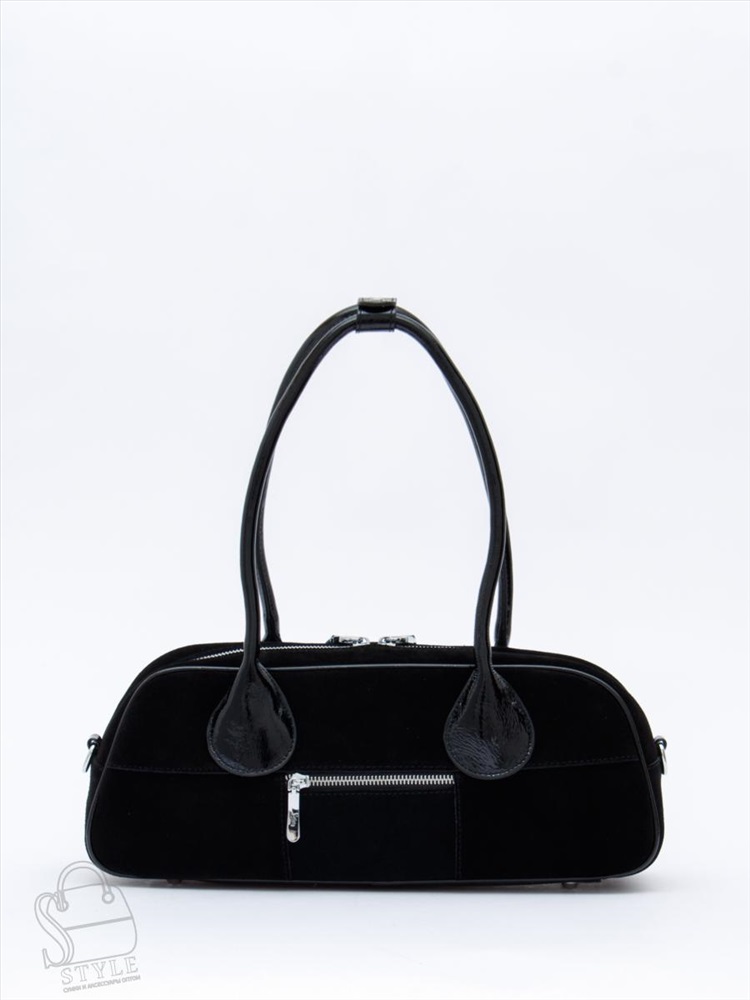 Артикул: 91161MSS black Материал: Замша Цвет: Черный Ширина (см): 10 Длина (см): 36 Высота (см): 14 Высота ручки (см): 20 Вес (г): 750 Стильная сумка-такса, выполнена из замши. Декорирована "собачками". Дополнена серебристой фурнитурой. Данная модель закрывается на молнию, носится в руке за встроенные ручки, на ручках имеется фиксатор. Или сумка носится на плече, в комплекте имеется съемный ремень с регулировкой длины. Каркас полужесткий. На дне предусмотрены ножки. Внутри: подкладочная ткань, на боковых стенках есть карман на молнии и открытый. Снаружи: основной отдел закрывается на молнию. На задней части карман на молнии. Комментарии к товару