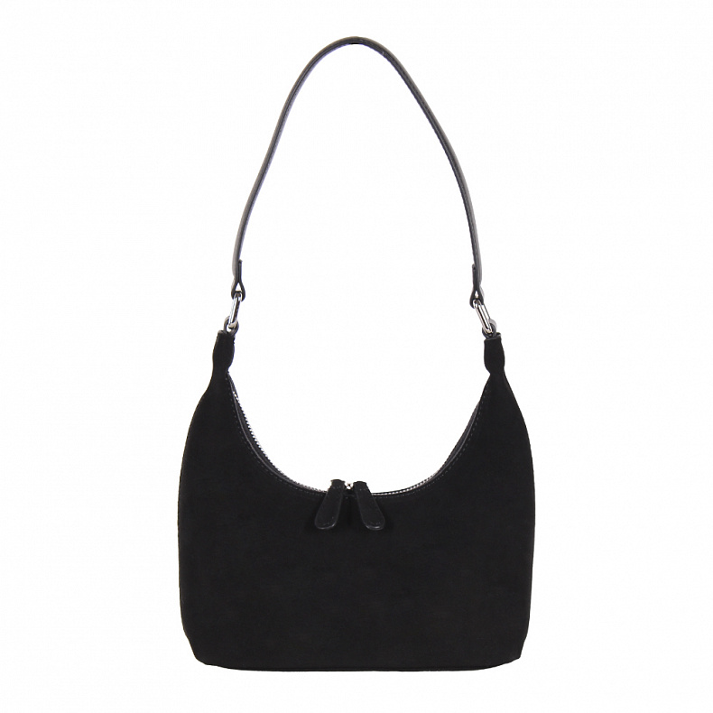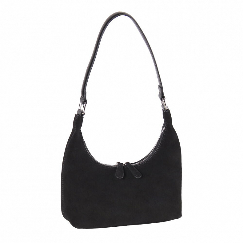 Сумка в форме мешок, выполнена из замши. Дополнена серебристой фурнитурой. Данная модель закрывается на молнию. Каркас мягкий. Носится через плечо и за ручку.