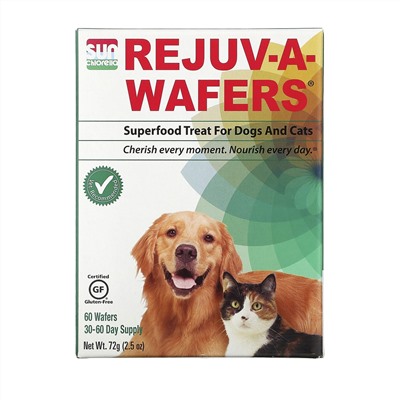 Rejuv-A-Wafers ® — это один из самых питательных натуральных суперфудов, который обеспечивает дополнительные полезные вещества для вашего питомца и способствует его здоровью. Rejuv-A-Wafers ® — это цельная пищевая добавка на растительной основе для ежедневного употребления, содержащая необходимые антиоксиданты, аминокислоты, витамин C, витамин D, витамин A, а также минералы, белок, бета-каротин, хлорофилл и клетчатку, которые помогут вашему любимцу быть здоровым. Rejuv-A-Wafers ® содержит эксклюзивный комплекс хлореллы Sun Chlorella®, которая измельчается DYNO ®-Mill, тем самым повышая биодоступность питательных веществ. Фактор роста хлореллы (CGF) — это уникальная совокупность питательных веществ, которые содержатся в таком сочетании только в хлорелле и не обнаружены ни в каких других витаминах, минералах, травах или продуктах питания. Хлорелла является источником полезных аминокислот, витаминов, пептидов, полисахаридов, бета-глюканов и нуклеиновых кислот. Rejuv-A-Wafers ® также содержит лютеин, чьи полезные свойства помогают поддерживать здоровье глаз вашего питомца. Наш уникальный продукт обладает адаптогенными свойствами, которые увеличивают способность организма преодолевать стрессы и сохранять молодость. Наличие лецитина содействует тому, чтобы кожа была здоровой, а шерсть —блестящей и ухоженной. Хлорофилл является естественным детоксикантом. Его клетчатка поддерживает здоровое пищеварение и обладает полезными дезодорирующими свойствами, которые обеспечивают свежесть дыхания и улучшают запах тела. Омолаживающая энергия естественного происхождения. Все мы хотим проводить как можно больше времени с нашими любимыми питомцами. Вот почему Rejuv-A-Wafers ® для всех домашних животных обладают адаптогенными свойствами, которые усиливают способность организма справляться со стрессом и в нужный момент снабжают питомца дополнительной энергией. Максимальная усвояемость. Наша эксклюзивная хлорелла Sun Chlorella®, измельченная в DYNO®-Mill, имеет максимальную усвояемость и обеспечивает беспрецедентный уровень полезных питательных веществ, чем выгодно отличается от продукции других брендов. Рекомендации по применениюЖивотные до 22,5 кг (50 фунтов): 1 таблетка Животные более 22,5 кг (50 фунтов): 2 таблетки Давайте своим питомцам Rejuv-A-Wafers ® каждый день в качестве вкусного угощения или добавляйте в корм. ИнгредиентыХлорелла, лецитин, женьшень. Не содержит сахара, искусственных ароматизаторов, красителей, консервантов. ПредупрежденияХранить Rejuv-A-Wafers® в сухом месте, избегая попадания солнечных лучей, влаги и воздуха.