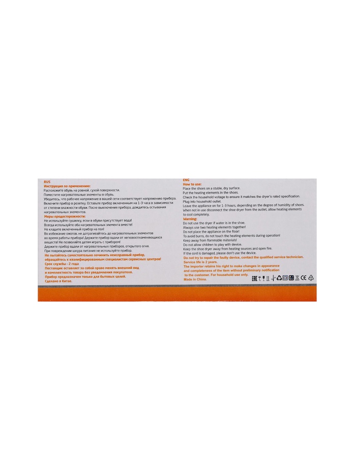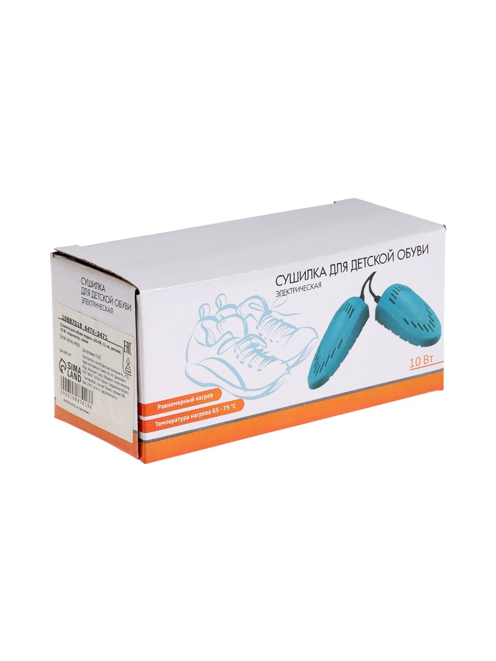 Страна: Китай В боксе: 68 шт Состав: Металл, пластик Материалы: металл, пластик Фасовка: по 1 шт Индивидуальная упаковка: Цветная картонная коробка Габариты товара: 11 см × 4 см × 2 см Сертификат: ЕАС Цвет: Синий Мощность, Вт: 10 Гарантийный срок, мес.: 6 Длина сушилки, см: 11 Компактная и эффективная сушилка для обуви мощностью 10 Вт разработана специально для детской обуви длиной до 11 см. Её яркий синий цвет привлекает внимание и отлично вписывается в интерьер детской комнаты, а функция индикатора работы позволяет легко контролировать процесс сушки. Низкое энергопотребление делает устройство экономичным, при этом оно быстро и бережно высушит обувь, предотвращая неприятные запахи и развитие бактерий. Благодаря компактным размерам сушилка легко помещается в шкаф или под кровать, не занимая много места.