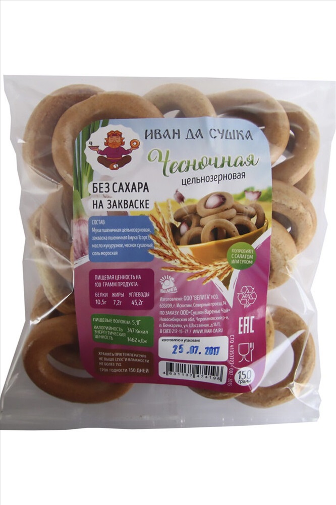 ID товара: 1191327 Состав: мука пшеничная цельнозерновая, закваска пшеничная (мука 1 сорт), масло кукурузное, чеснок сушеный, соль морская Сезон: Демисезон Производитель: Иван да Срок годности (мес): 5 Вес: (г), 150 Страна бренда: Россия Страна производства: Россия Сушки чесночные ц\з на закваске без сахара 150г Комментарии к товару