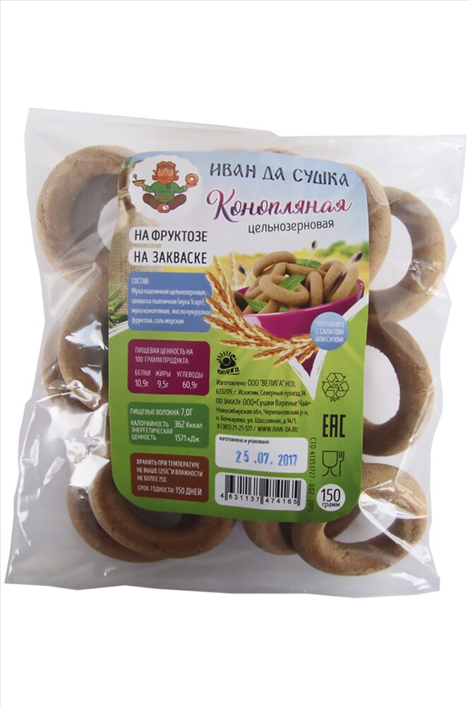 ID товара: 1191320 Состав: мука пшеничная цельнозерновая, мука конопляная, закваска пшеничная (мука 1сорт), масло кукурузное, фруктоза, соль морская. Сезон: Демисезон Производитель: Иван да Срок годности (мес): 5 Вес: (г), 150 Страна бренда: Россия Страна производства: Россия Сушки конопляные ц\з на закваске на фруктозе 150г Комментарии к товару