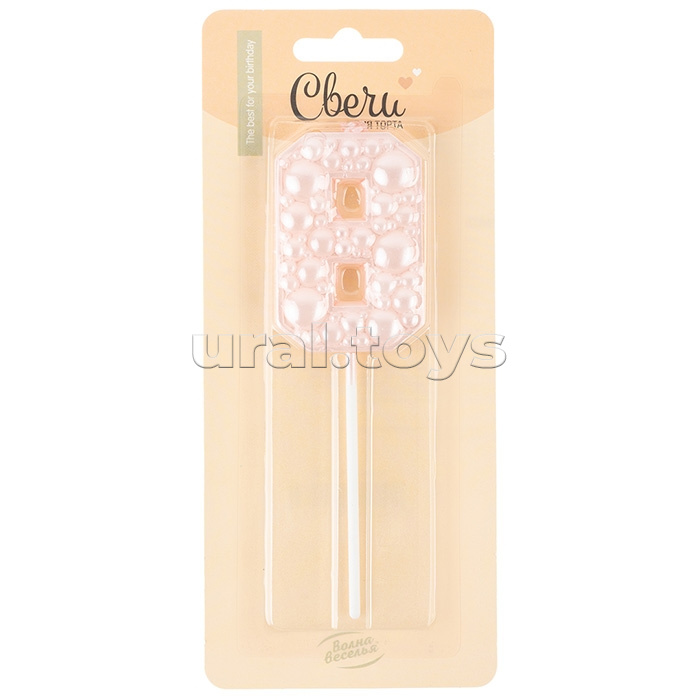Свеча Цифра, 8 Воздушный жемчуг, на шпажке, Нежно-розовый, Перламутр, 6 см, 1 шт. с держат.