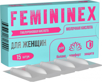 "ФЕМИНИНЕКС" — свечи женские вагинальные. Избавляют от сухости и раздражений, способствуют регенерации тканей, улучшают их эластичность, нормализуют pH баланс, улучшают барьерную функцию, обеспечивая поддержку здоровой микрофлоры. Отличаются высокой биодоступностью компонентов, действуют уже с первого применения, не ограничены по времени использования, не требуют хранения в холодильнике. Рекомендованы для: Нормализации микрофлоры и уровня pH (в т.ч. после приёма антибиотиков и гинекологических процедур); Создания ощущения комфорта в интимной зоне (при зуде, сухости и раздражениях); Повышения местного иммунитета (в т.ч. перед отдыхом на море, в купальный сезон); Восстановления эластичности тканей (для улучшения качества сексуальной жизни в период менопаузы). Состав: масло какао, пчелиный воск, гиалуроновая кислота, молочная кислота. Способ применения взрослым по 1 дозе (1 доза = содержимое 1 ячейки) 1 раз в день перед сном после гигиенических процедур. Противопоказания повышенная чувствительность к компонентам.