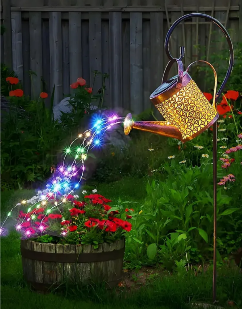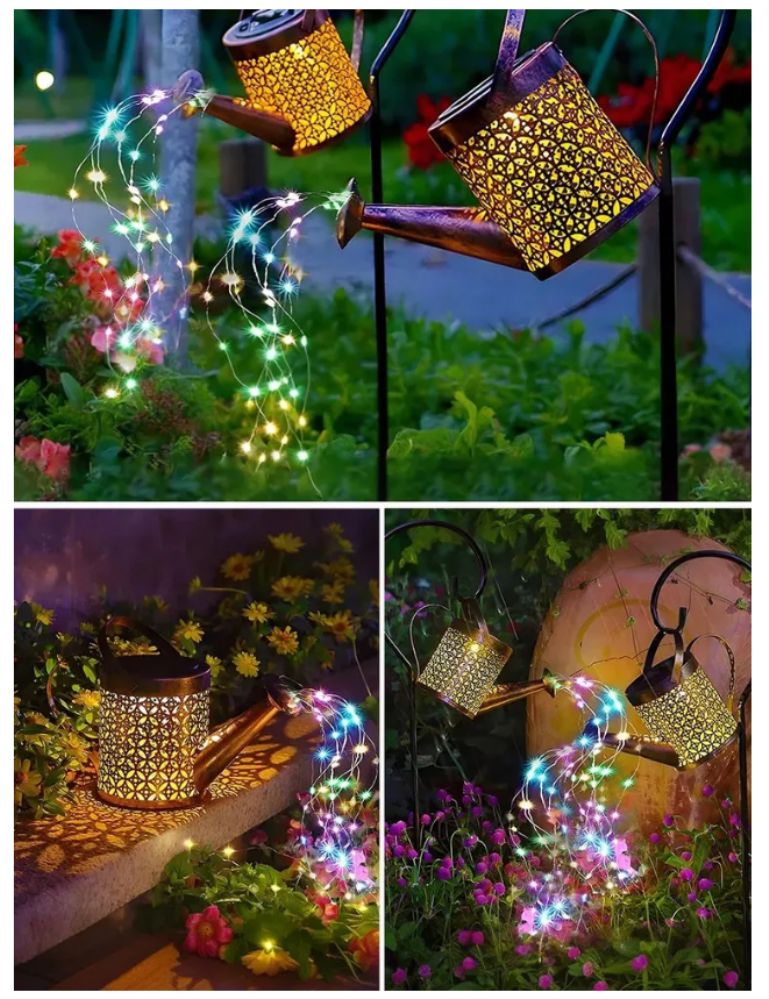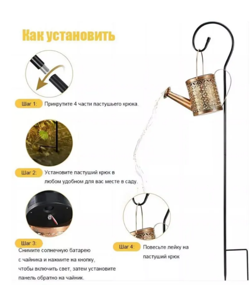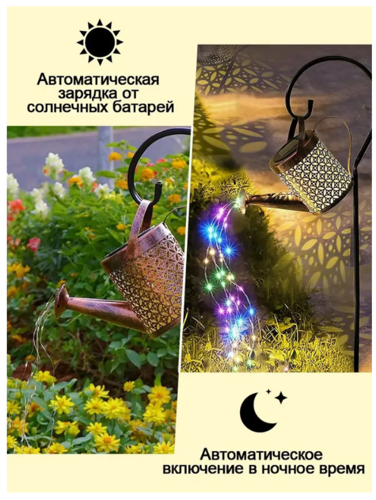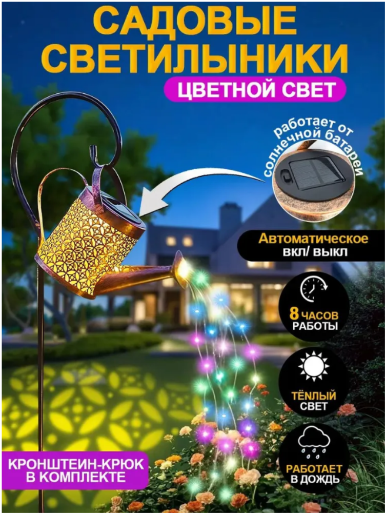 Светильник уличный цветной на солнечных батареях "Лейка" Уличный светильник для дачи в виде лейки с разноцветными огоньками станет прекрасным декором на вашем дачном и садовом участке. Садовая фигура выполнена из железа под старину и имеет красивый узор, который отбрасывает сказочный свет на стену или на пол. А мигающие разноцветные светодиоды создают иллюзию струящейся воды. Светильник для дачи станет отличным подарком для тех, кто имеет собственный загородный дом, дачу или сад, ведь он имеет уникальный дизайн и романтическое теплое освещение. Высокоэффективная солнечная панель преобразует солнечную энергию в электрическую и сохраняет ее во встроенной солнечной батарее. В течении дня светильник для дачи поглощает энергию солнца, а ночью он автоматически загорается примерно на 7-8 часов. Уличный фонарь прост в установке - просто воткните его в землю и он станет прекрасным декором для сада и для дачи Комментарии к товару