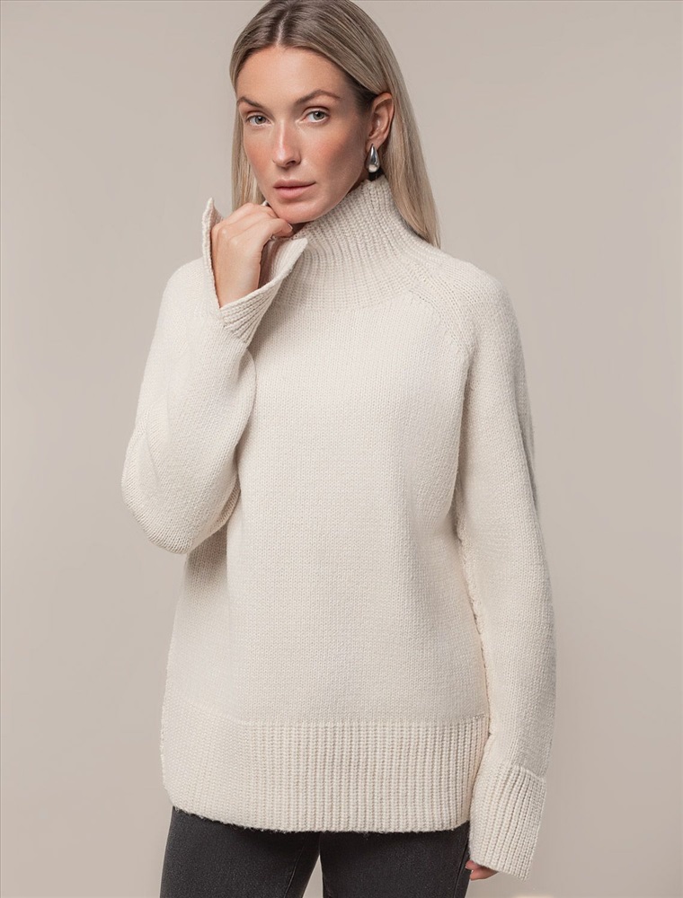 Свитер в овсяном оттенке выполнен из уютной пряжи крупной вязки с ангорой и легким пушистым мохером, поэтому изделие получилось особенно приятным на ощупь. Пряжу укрепили нитями нейлона, благодаря чему изделие не вытянется со временем и сохранит свою форму. Лаконичную модель дополнили металлическим логотипом бренда.