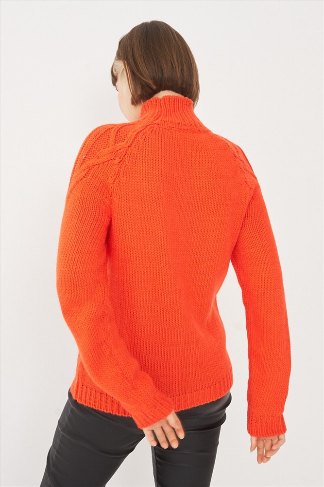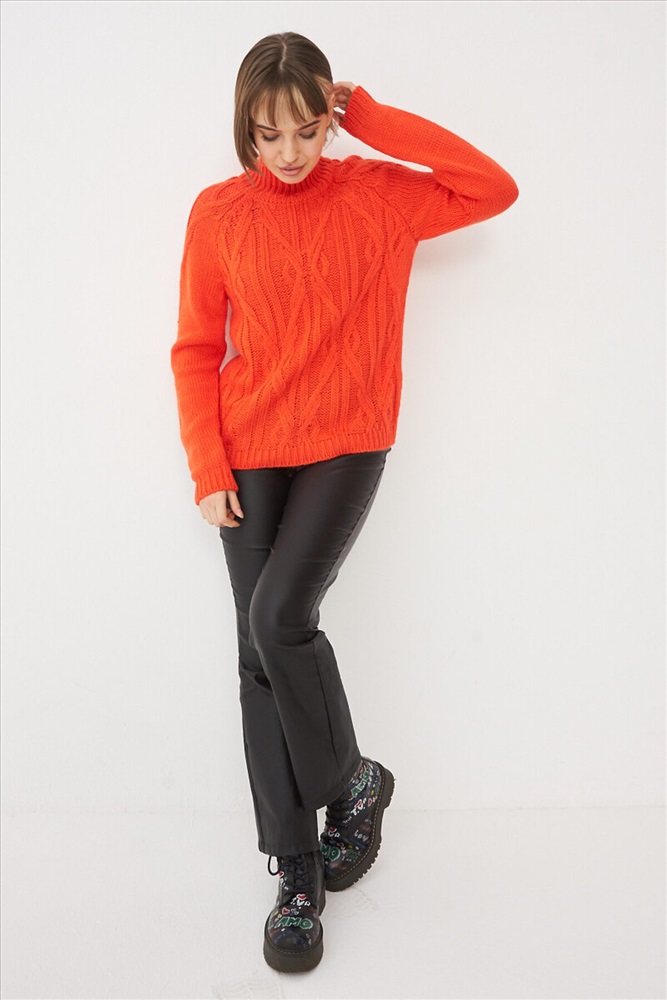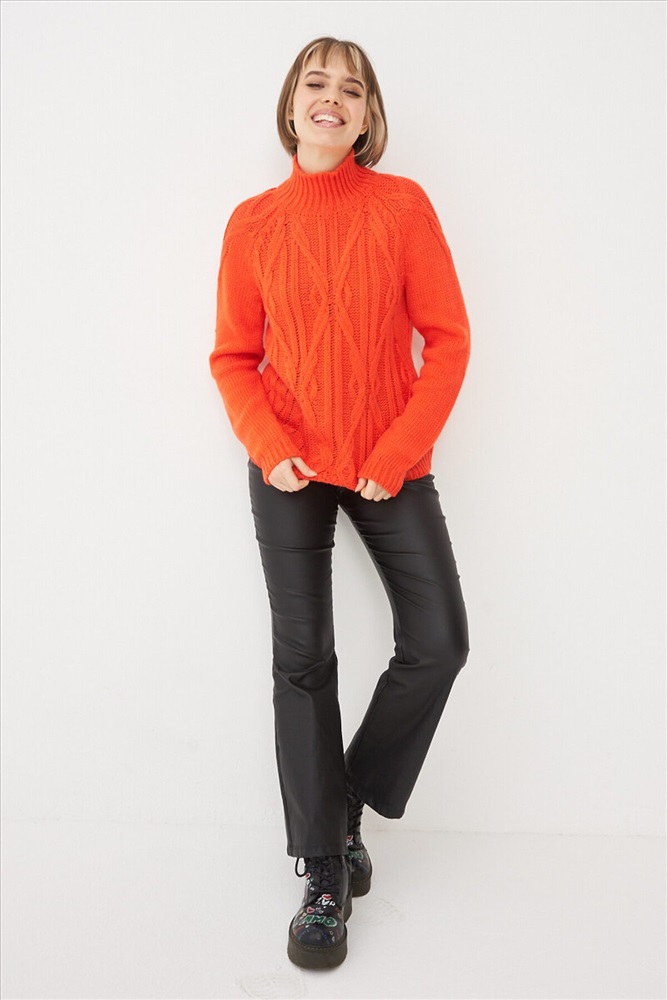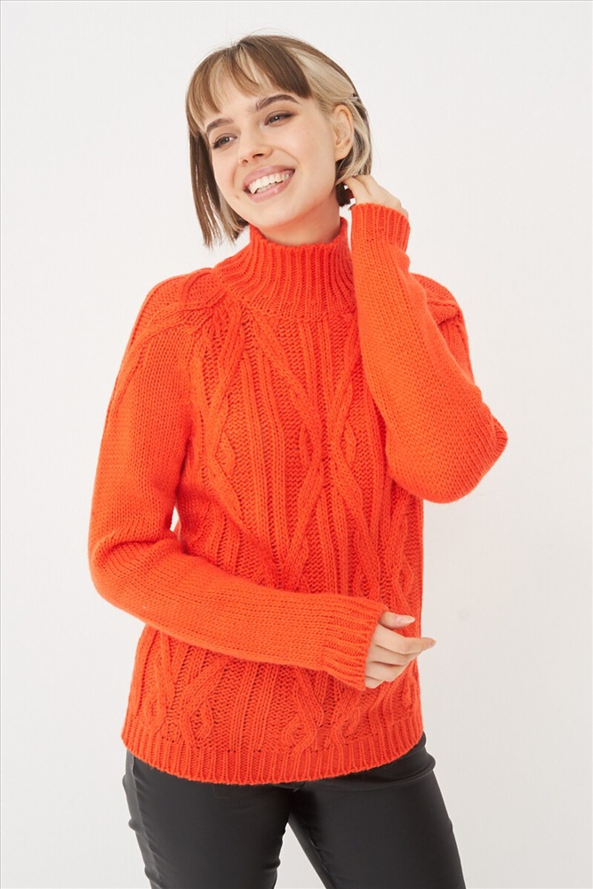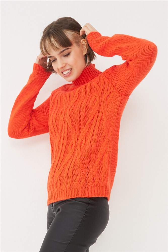 Женский свитер с высоким воротником-стойкой и вязаным узором.