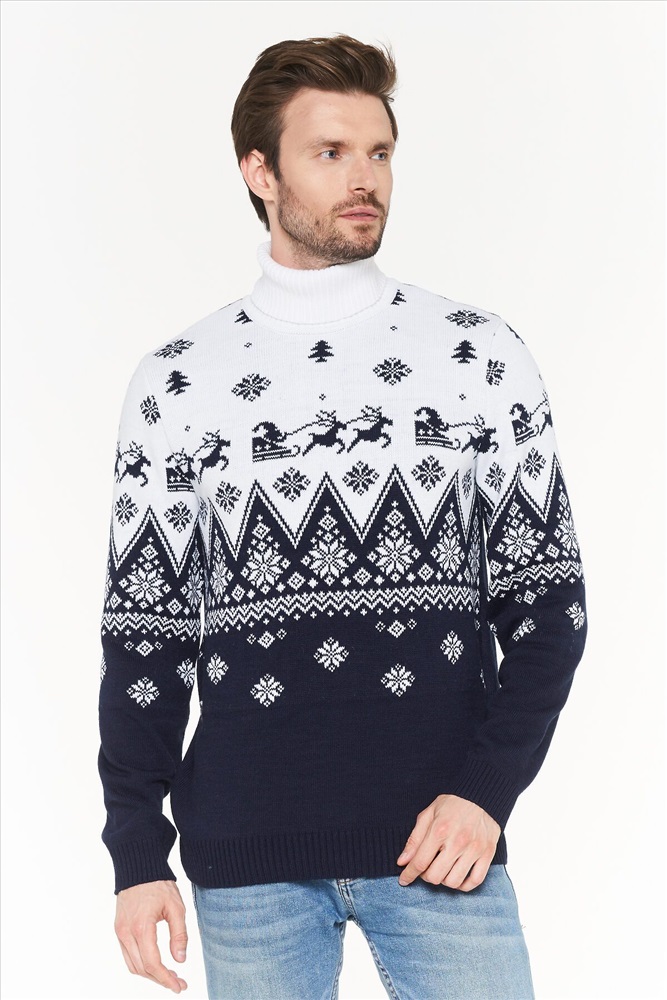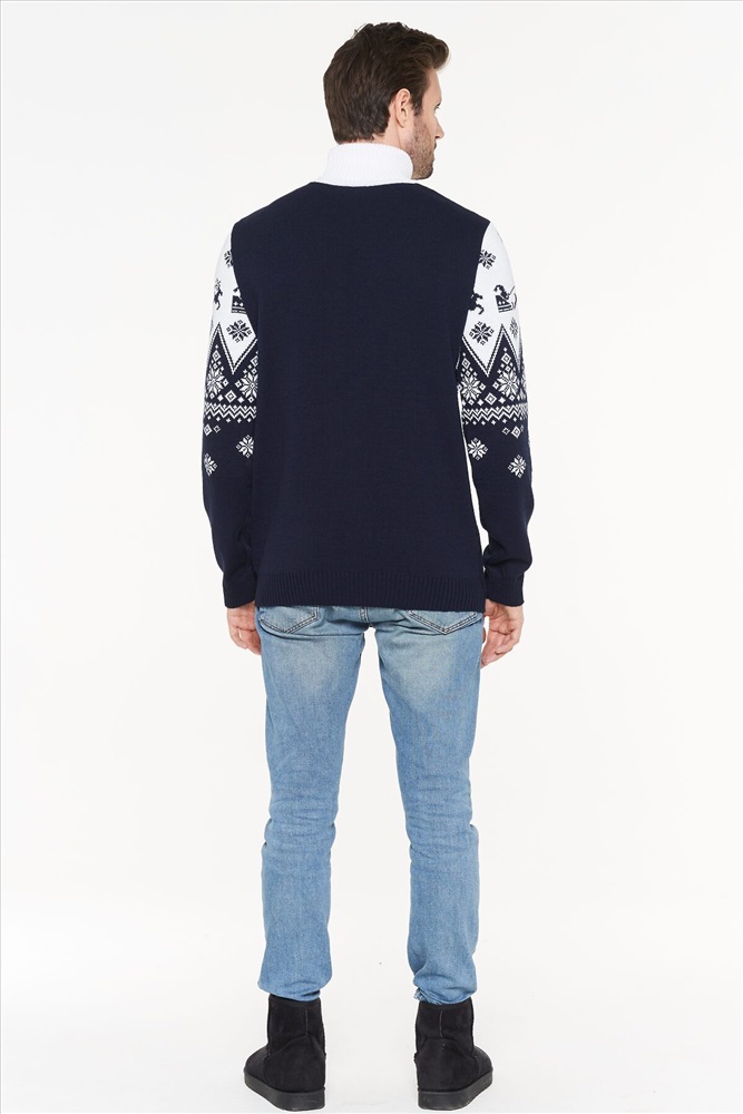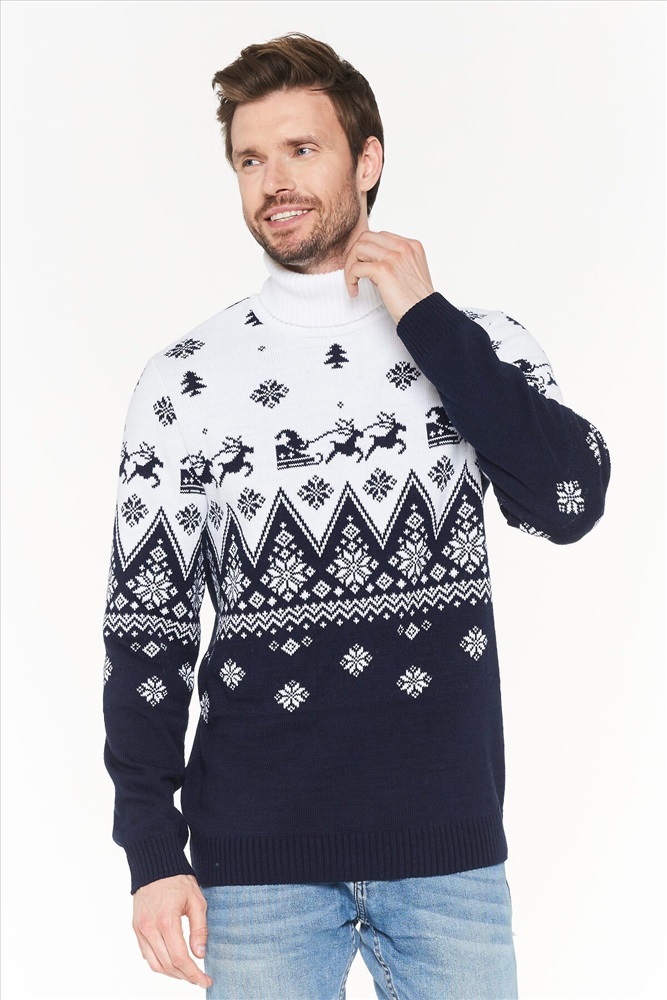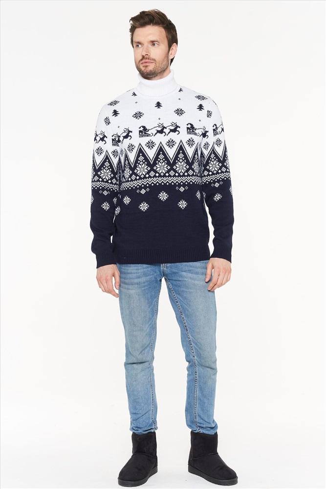 Мужской трикотажный свитер с "зимним" принтом. Прямой силуэт, длинные рукава и высокий ворот.