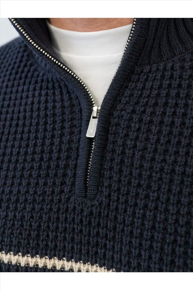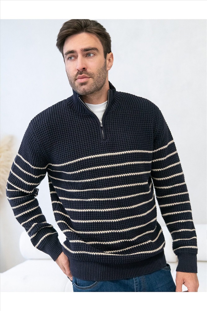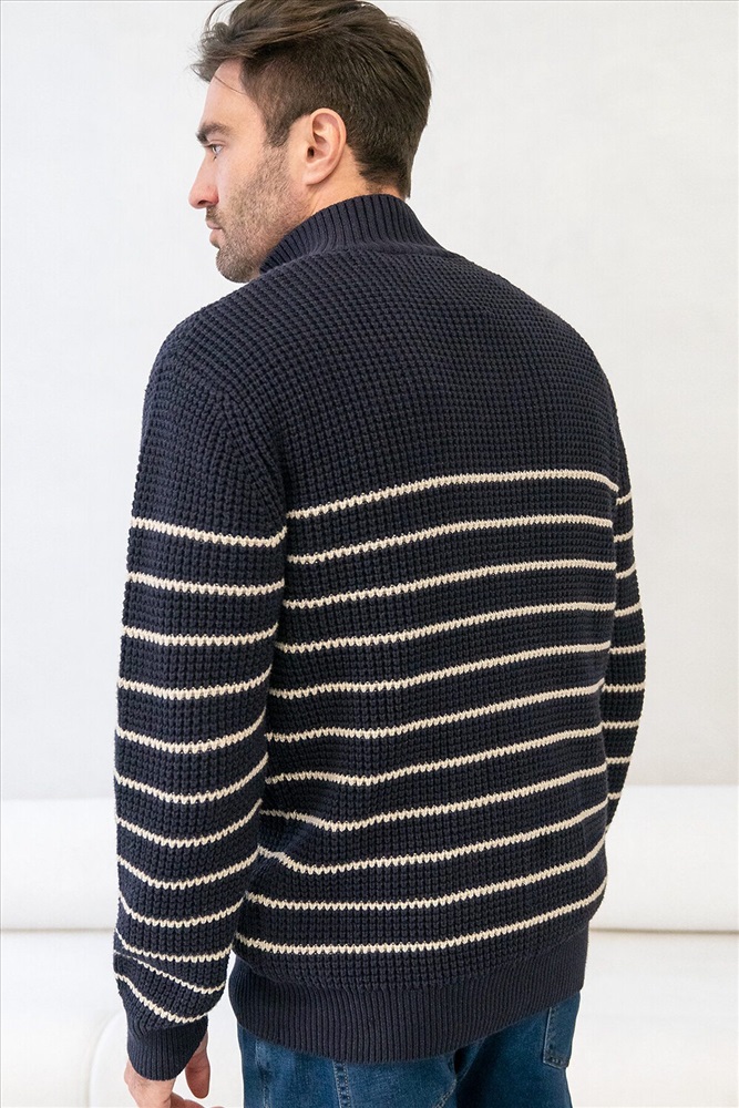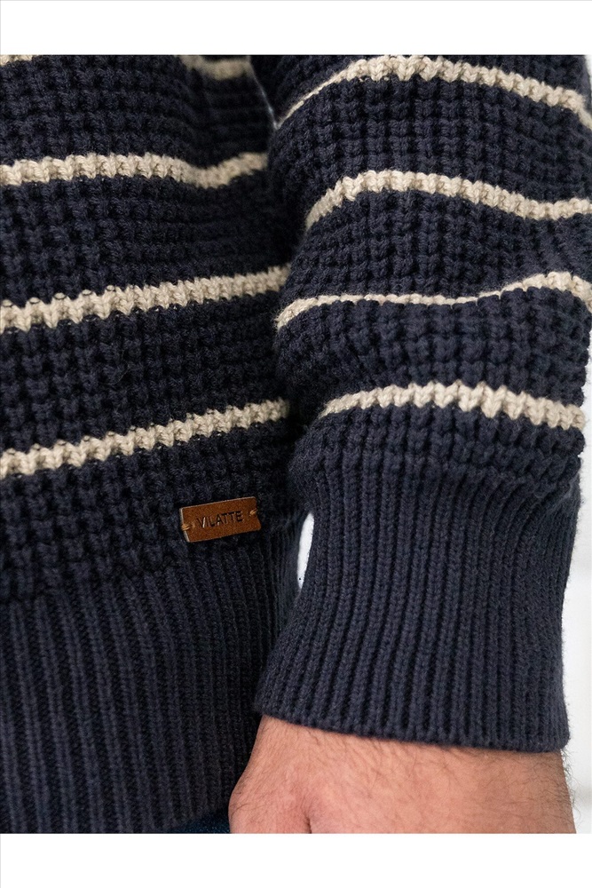 Свитер с узором полосы выполнен из хлопковой пряжи с добавлением акрила. Теплая модель фактурной крупной вязки с воротом, застегивается металлической молнией. Регулируя ворот можно носить с рубашками, футболками и водолазками. Кроме того, свитер совершенно не колется, поэтому его комфортно носить даже на голое тело. Внизу изделия нашивка бренда из эко-кожи.