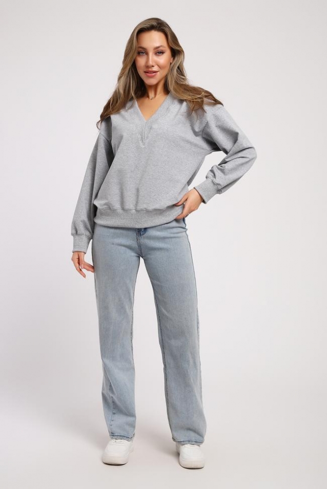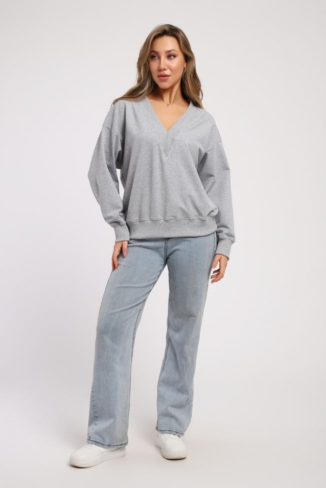 Свитшот свободного кроя с длинными рукавами на манжетах и V - образным вырезом горловины.