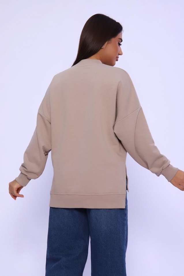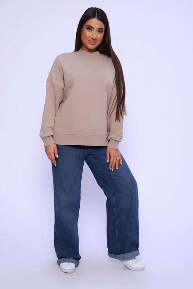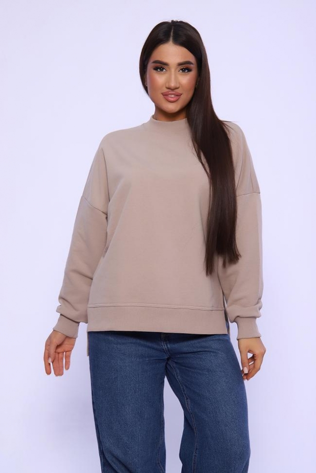 Свитшот женский , выполнен в классических цветах. Особенность этой модели- спущенный рукав (летучая мышь), удлиненная спинка и боковые разрезы. Округлая горловина декорированная отстрочкой. Свитшот изготовлен из футера 3х нитки (петля). В 52 и 54 размеры, по спинке шов.